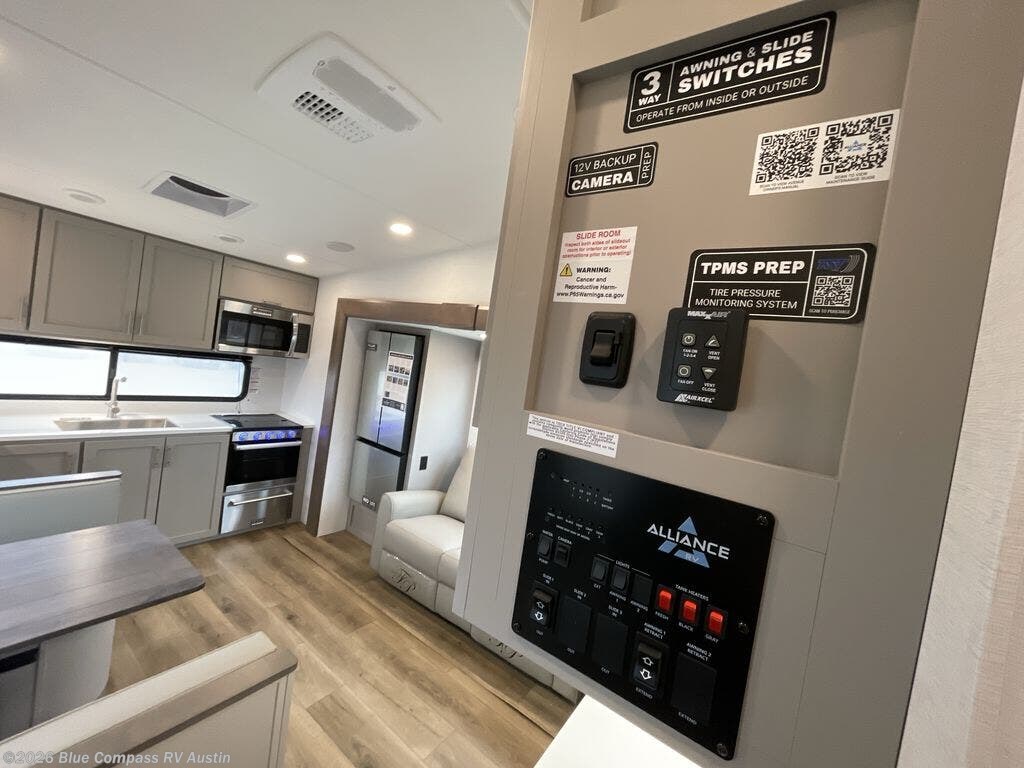 A benchmark chassis creates a space saver upper deck with each one of these Avenue All-Access fifth wheels by Alliance RV! The 101 in. wide-body construction gives you more room to walk around and the flush slide out floors throughout prevent any tripping. There are composite sidewalls inside and out, and PVC roof for extreme durability. You are sure to love no carpet throughout making each Avenue All-Access easy to clean and allergen free, not to mention pet friendly. You can maximize your space throughout with innovative storage solutions like the hidden storage behind the TV, inside the end tables, ottoman, and dinette chairs. These units also include the OTG Solar Package with a 200 watt solar panel, 15 amp MPPT charger, multiple outlets, and more to keep you powered up!