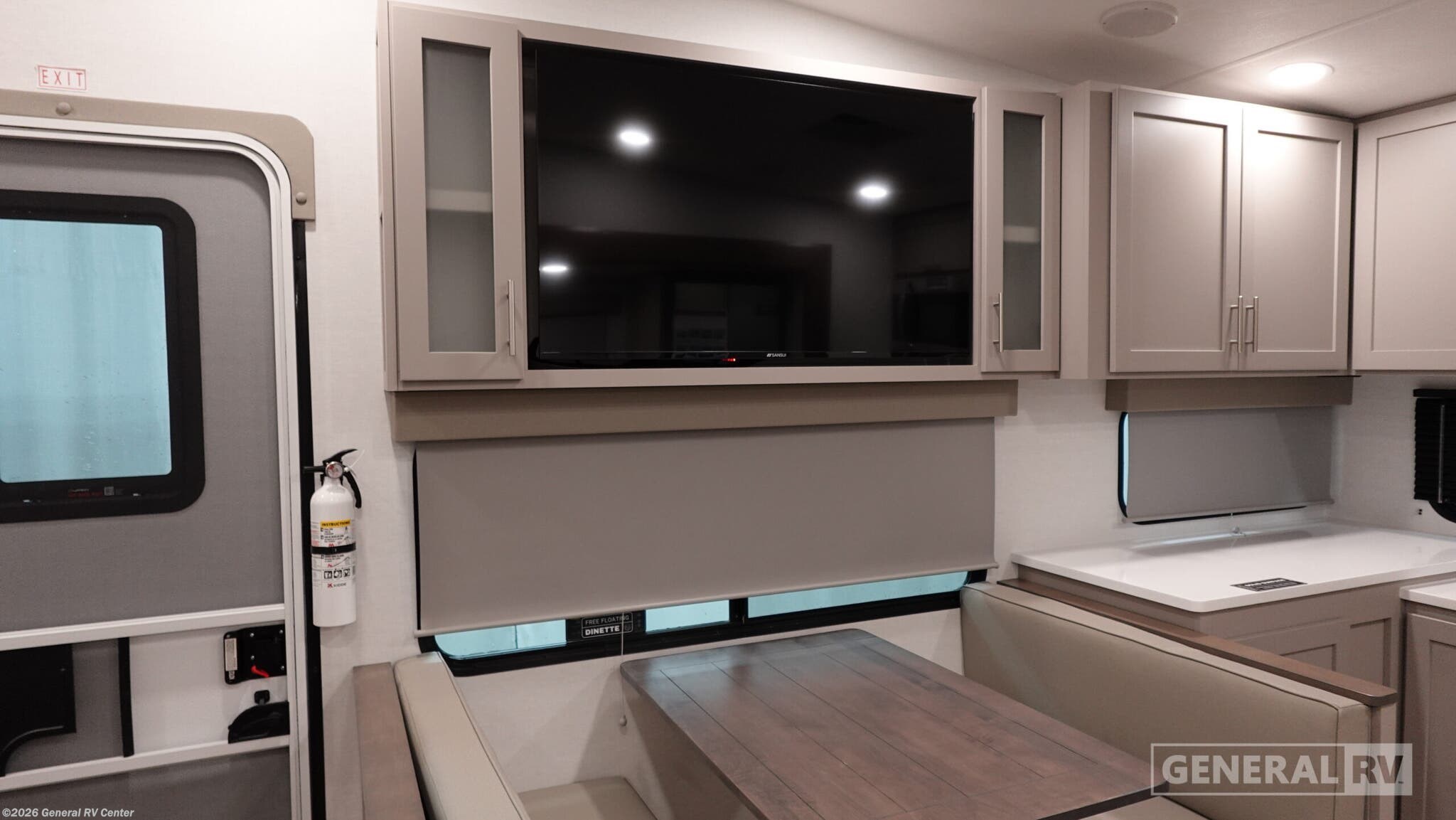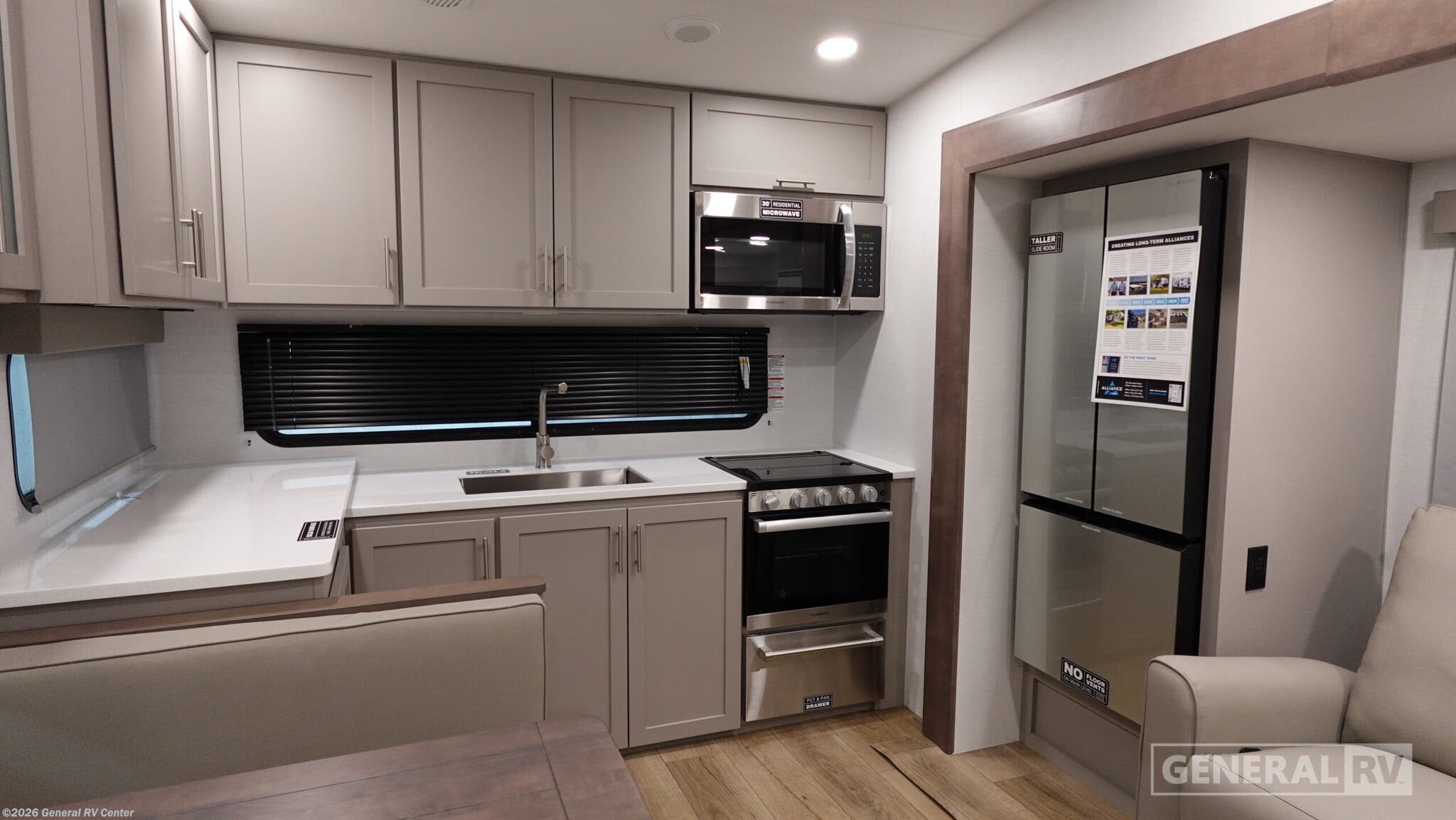 **Alliance RV Avenue All-Access fifth wheel 23ML highlights:** - Rear Kitchen - Spacious Full Bath - Exterior Griddle Grill and Refrigerator This fifth wheel is ready for adventure when you are! Once you arrive at the campground, you can put out the 16' awning, then start lunch on the exterior griddle. A booth dinette and theater sofa provide seating space inside, and there is a 50" Class HDTV to enjoy movies. The chef will also love the interior kitchen with its ample counter space, and there is plenty of storage with a hutch/pantry, second pantry, and 10 cu. ft. 12V refrigerator. Freshen up in the full bath before heading off to bed in the front private bedroom. Here, you'll find a king bed, dual nightstands and overhead storage, plus a wardrobe with washer and dryer prep if you choose to add those appliances! A benchmark chassis creates a space saver upper deck with each one of these Avenue All-Access fifth wheels by Alliance RV! The 101 in. wide-body construction gives you more room to walk around and the flush slide out floors throughout prevent any tripping. There are Azdel composite sidewalls inside and out, and a seamless fully walkable PVC roof for extreme durability and zero maintenance. You are sure to love no carpet throughout making each Avenue All-Access easy to clean and allergen free, not to mention pet friendly. You can maximize your space throughout with innovative storage solutions like the hidden storage behind the TV, inside the end tables, ottoman, and dinette chairs. These units also include the OTG Solar Package with a 200 watt solar panel, 15 amp MPPT charger, multiple outlets, and more to keep you powered up!