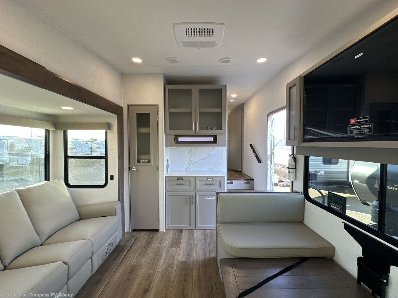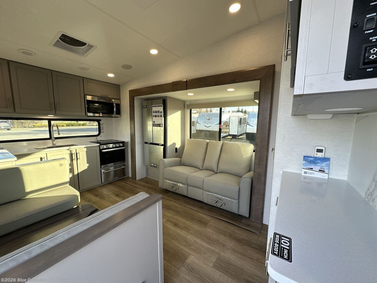 A benchmark chassis creates a space saver upper deck with each one of these Avenue All-Access fifth wheels by Alliance RV! The 101 in. wide-body construction gives you more room to walk around and the flush slide out floors throughout prevent any tripping. There are composite sidewalls inside and out, and PVC roof for extreme durability. You are sure to love no carpet throughout making each Avenue All-Access easy to clean and allergen free, not to mention pet friendly. You can maximize your space throughout with innovative storage solutions like the hidden storage behind the TV, inside the end tables, ottoman, and dinette chairs. These units also include the OTG Solar Package with a 200 watt solar panel, 15 amp MPPT charger, multiple outlets, and more to keep you powered up!