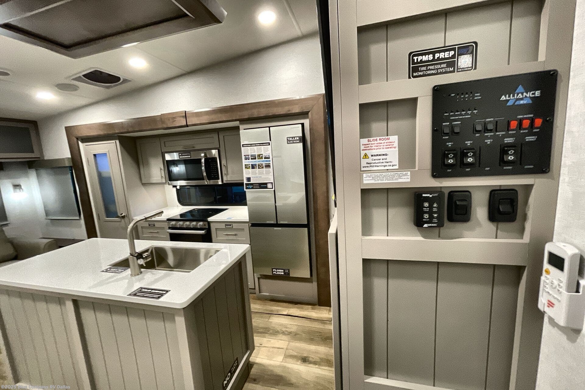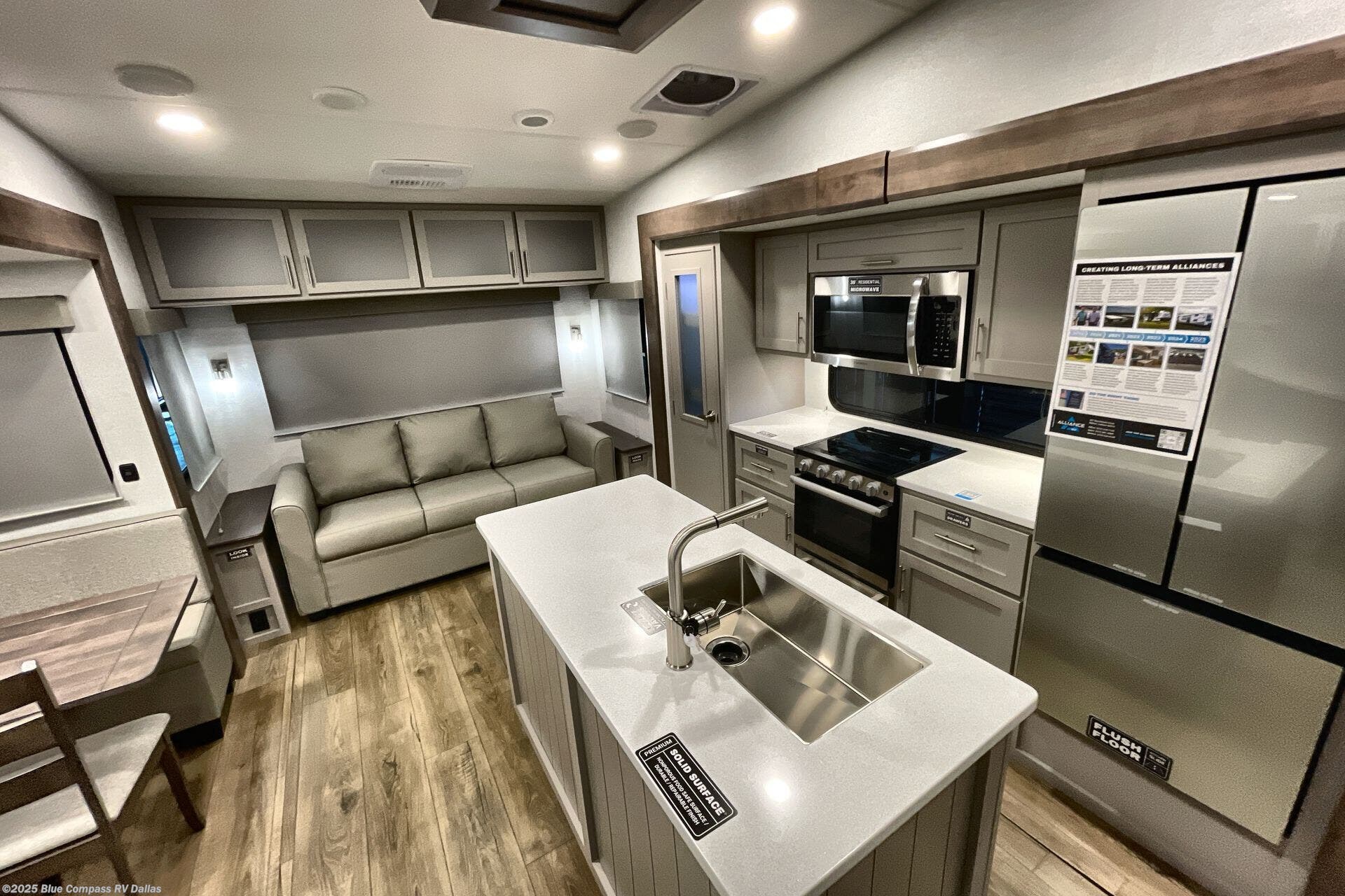 A benchmark chassis creates a space saver upper deck with each one of these Avenue All-Access fifth wheels by Alliance RV! The 101 in. wide-body construction gives you more room to walk around and the flush slide out floors throughout prevent any tripping. There are composite sidewalls inside and out, and PVC roof for extreme durability. You are sure to love no carpet throughout making each Avenue All-Access easy to clean and allergen free, not to mention pet friendly. You can maximize your space throughout with innovative storage solutions like the hidden storage behind the TV, inside the end tables, ottoman, and dinette chairs. These units also include the OTG Solar Package with a 200 watt solar panel, 15 amp MPPT charger, multiple outlets, and more to keep you powered up!