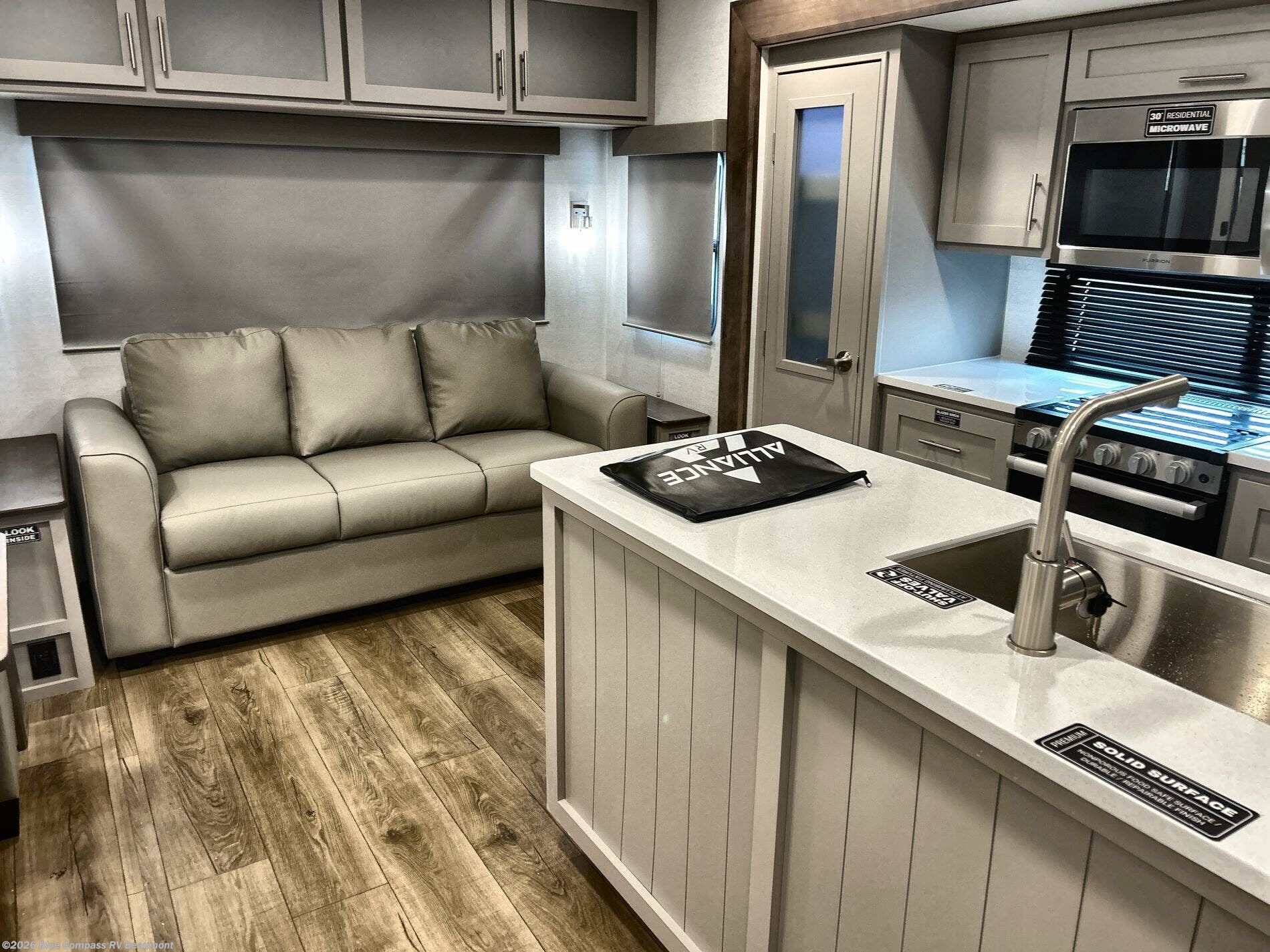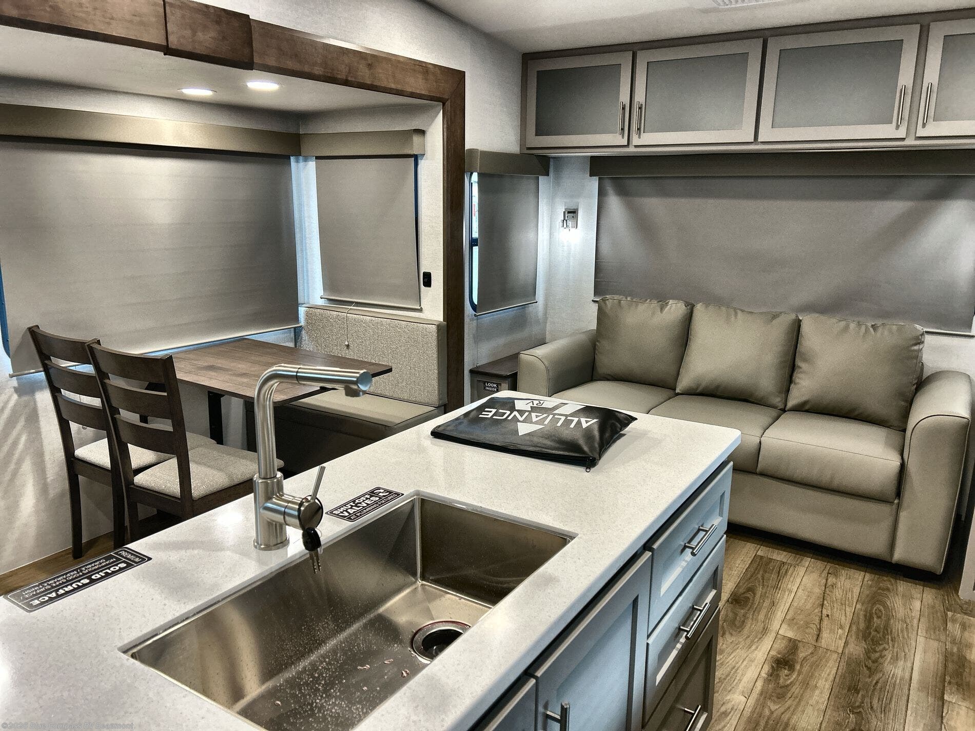 A benchmark chassis creates a space saver upper deck with each one of these Avenue All-Access fifth wheels by Alliance RV! The 101 in. wide-body construction gives you more room to walk around and the flush slide out floors throughout prevent any tripping. There are composite sidewalls inside and out, and PVC roof for extreme durability. You are sure to love no carpet throughout making each Avenue All-Access easy to clean and allergen free, not to mention pet friendly. You can maximize your space throughout with innovative storage solutions like the hidden storage behind the TV, inside the end tables, ottoman, and dinette chairs. These units also include the OTG Solar Package with a 200 watt solar panel, 15 amp MPPT charger, multiple outlets, and more to keep you powered up!
