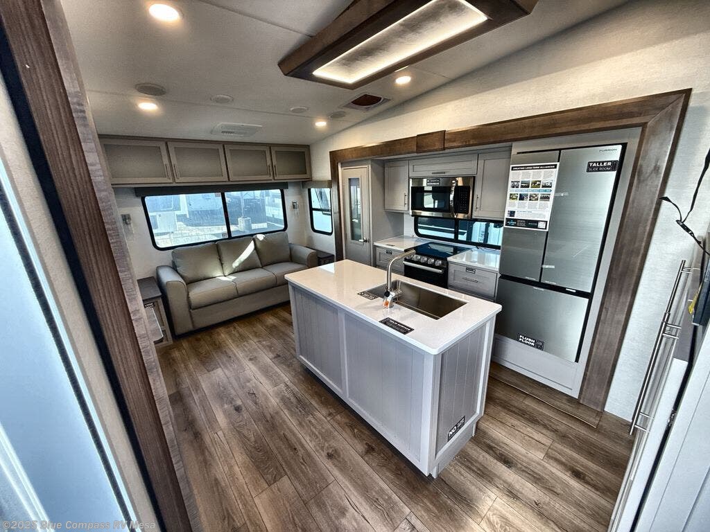 Perfect for families, couples, and travelers who crave space and style. The heart of this fifth wheel is the spacious living area, featuring a tri-fold sleeper sofa that's perfect for lounging and sleeping. Gather around the table with chairs and a bench for meals or socializing. The kitchen is fully equipped with a kitchen island, pantry, hutch, and overhead cabinets, providing ample storage and counter space. The microwave and 10 cu 12V refrigerator ensure that meal preparation and storage are convenient and easy. The full bathroom offers a private space for personal care, ensuring a comfortable and refreshing experience, and the front bedroom is a peaceful retreat, featuring a queen bed, nightstands, and overhead storage.