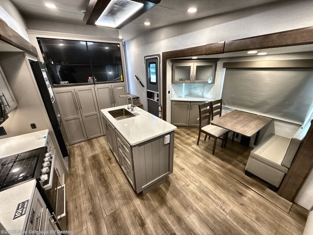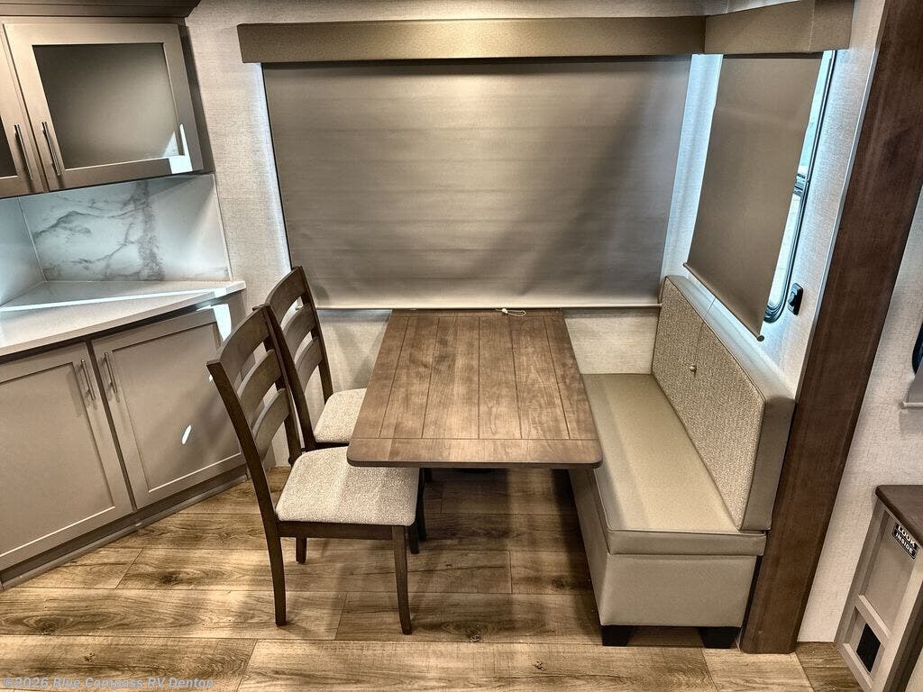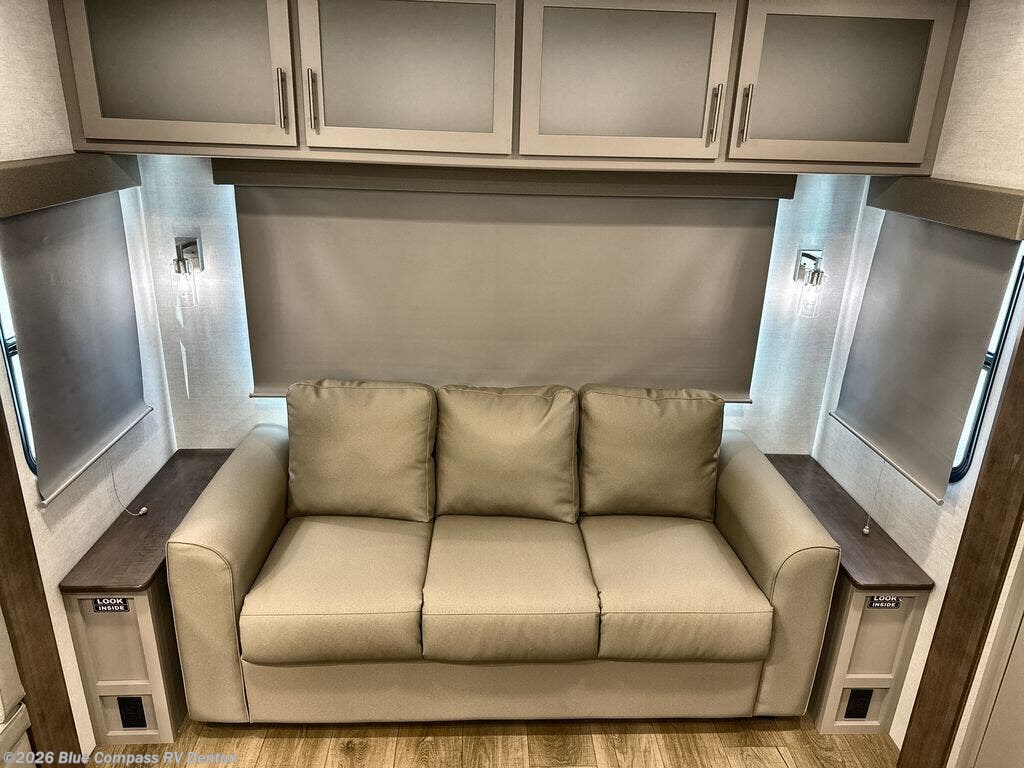 Perfect for families, couples, and travelers who crave space and style. The heart of this fifth wheel is the spacious living area, featuring a tri-fold sleeper sofa that's perfect for lounging and sleeping. Gather around the table with chairs and a bench for meals or socializing. The kitchen is fully equipped with a kitchen island, pantry, hutch, and overhead cabinets, providing ample storage and counter space. The microwave and 10 cu 12V refrigerator ensure that meal preparation and storage are convenient and easy. The full bathroom offers a private space for personal care, ensuring a comfortable and refreshing experience, and the front bedroom is a peaceful retreat, featuring a queen bed, nightstands, and overhead storage.