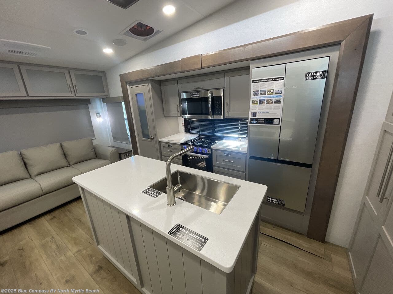 A benchmark chassis creates a space saver upper deck with each one of these Avenue All-Access fifth wheels by Alliance RV! The 101 in. wide-body construction gives you more room to walk around and the flush slide out floors throughout prevent any tripping. There are composite sidewalls inside and out, and PVC roof for extreme durability. You are sure to love no carpet throughout making each Avenue All-Access easy to clean and allergen free, not to mention pet friendly. You can maximize your space throughout with innovative storage solutions like the hidden storage behind the TV, inside the end tables, ottoman, and dinette chairs. These units also include the OTG Solar Package with a 200 watt solar panel, 15 amp MPPT charger, multiple outlets, and more to keep you powered up!