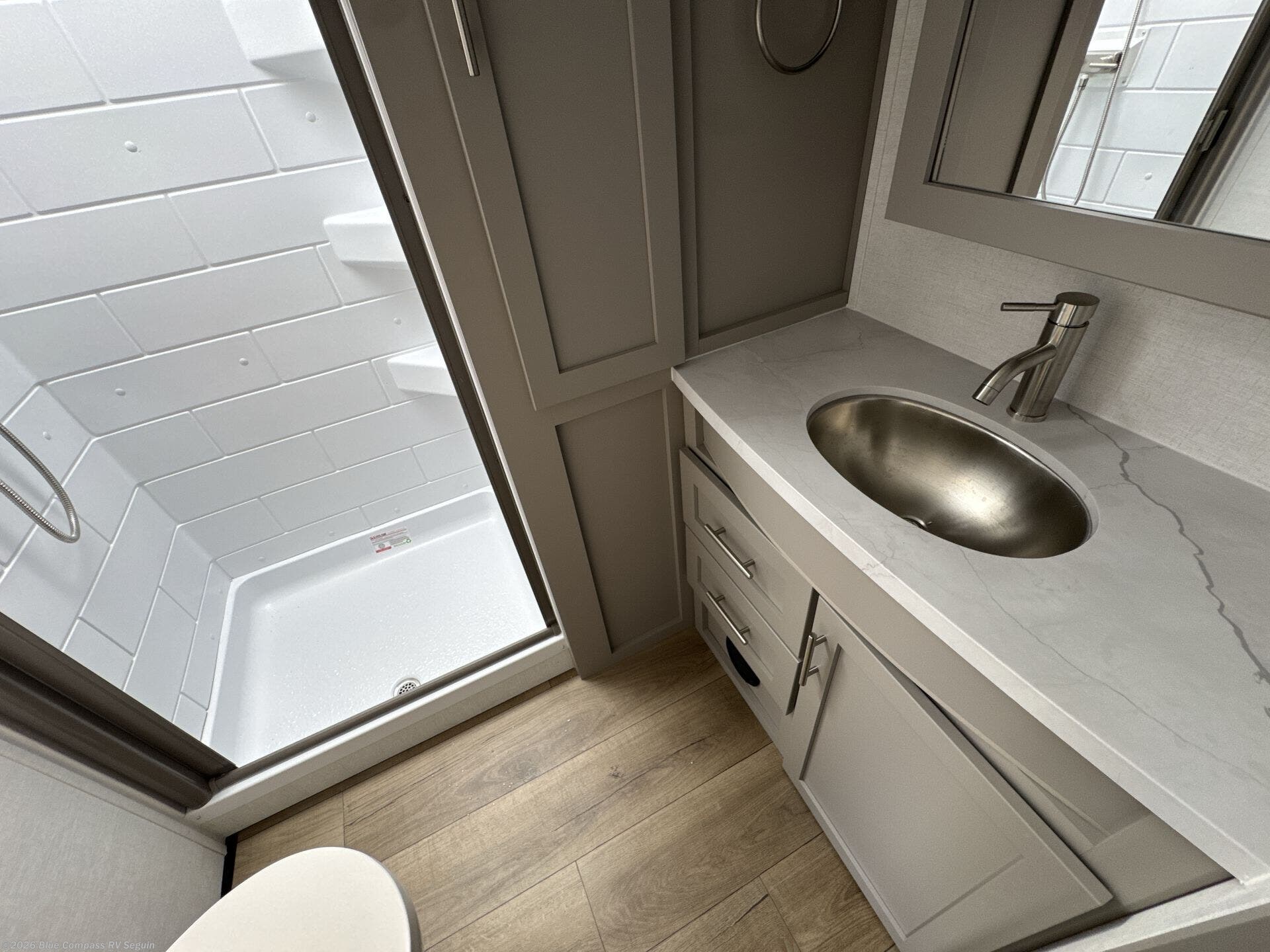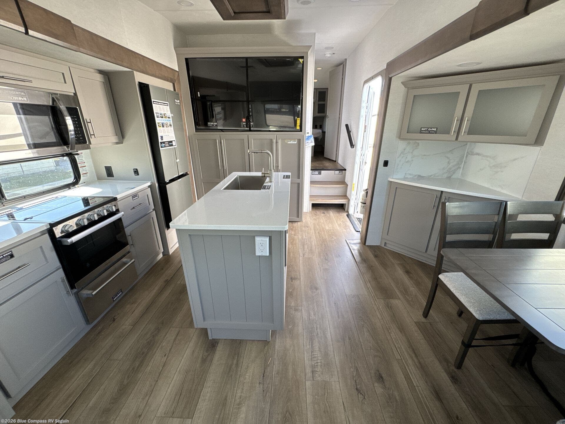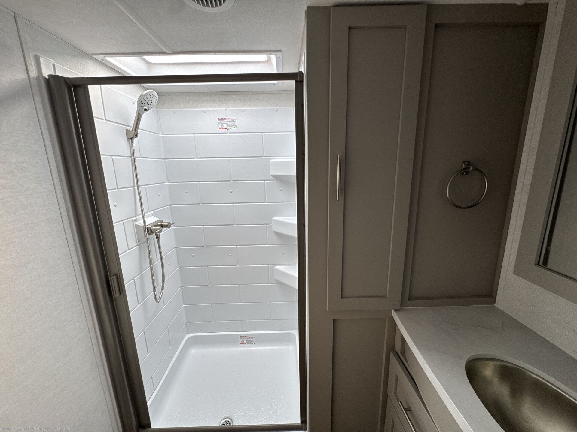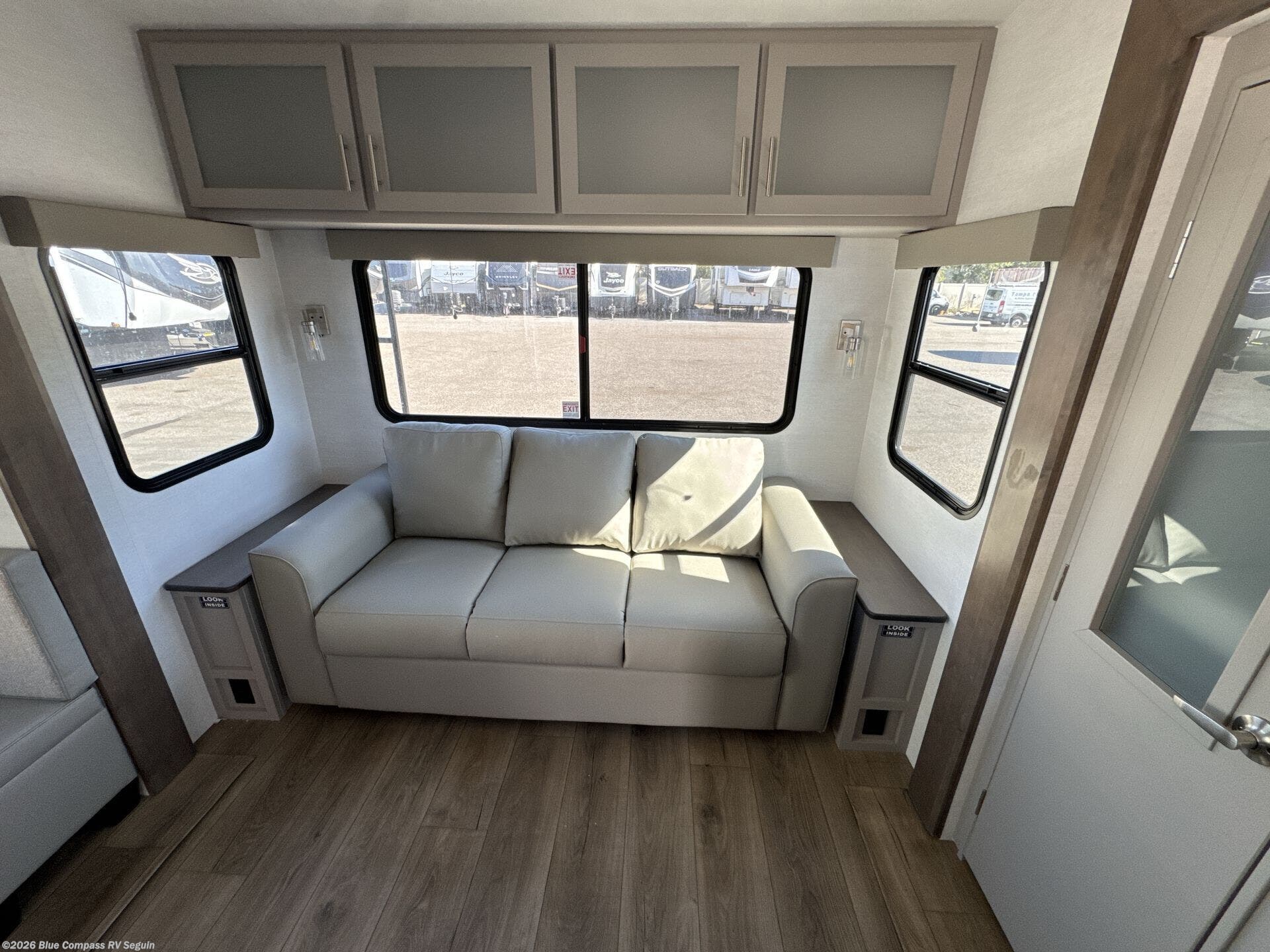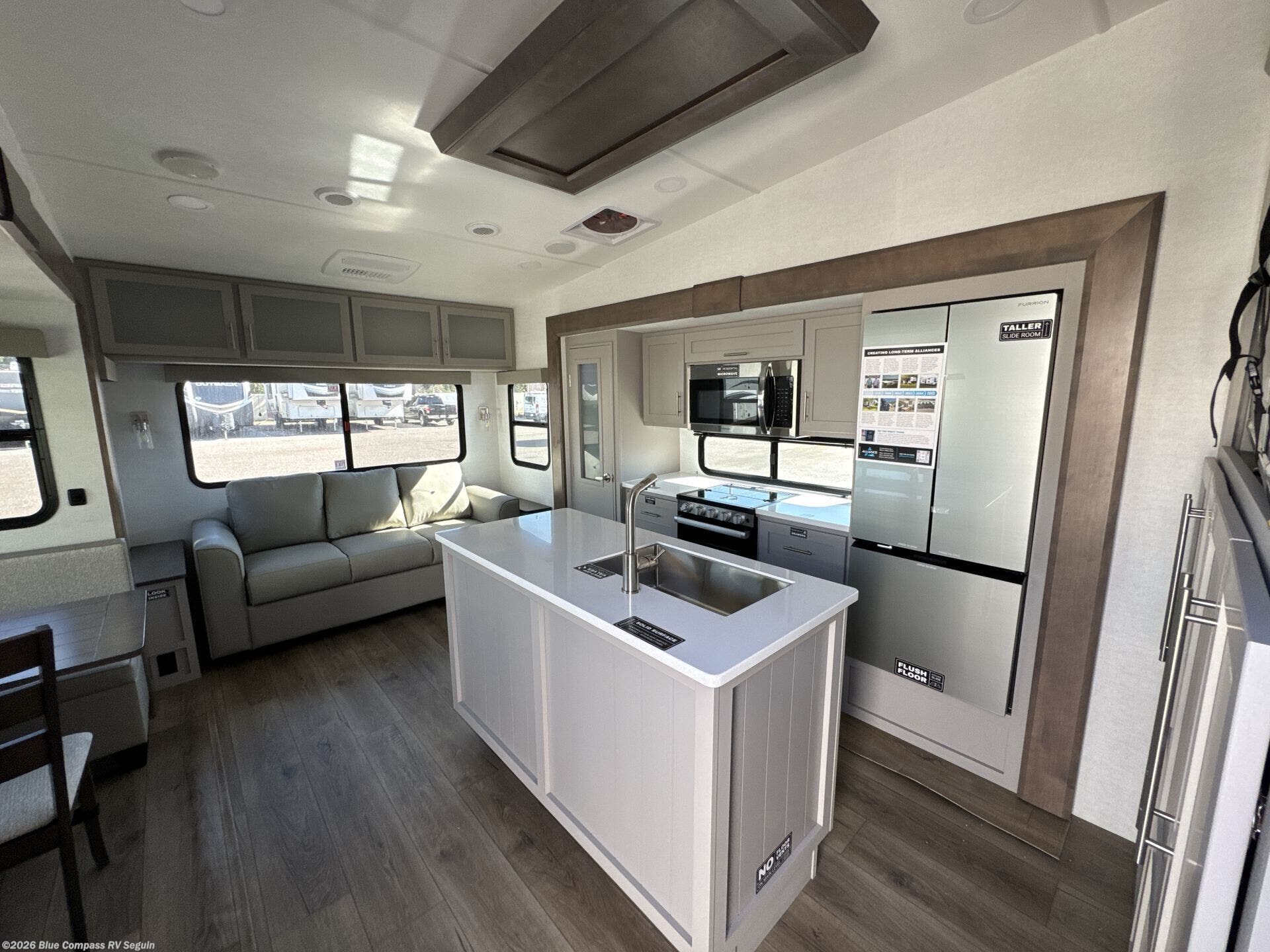 Perfect for families, couples, and travelers who crave space and style. The heart of this fifth wheel is the spacious living area, featuring a tri-fold sleeper sofa that's perfect for lounging and sleeping. Gather around the table with chairs and a bench for meals or socializing. The kitchen is fully equipped with a kitchen island, pantry, hutch, and overhead cabinets, providing ample storage and counter space. The microwave and 10 cu 12V refrigerator ensure that meal preparation and storage are convenient and easy. The full bathroom offers a private space for personal care, ensuring a comfortable and refreshing experience, and the front bedroom is a peaceful retreat, featuring a queen bed, nightstands, and overhead storage.