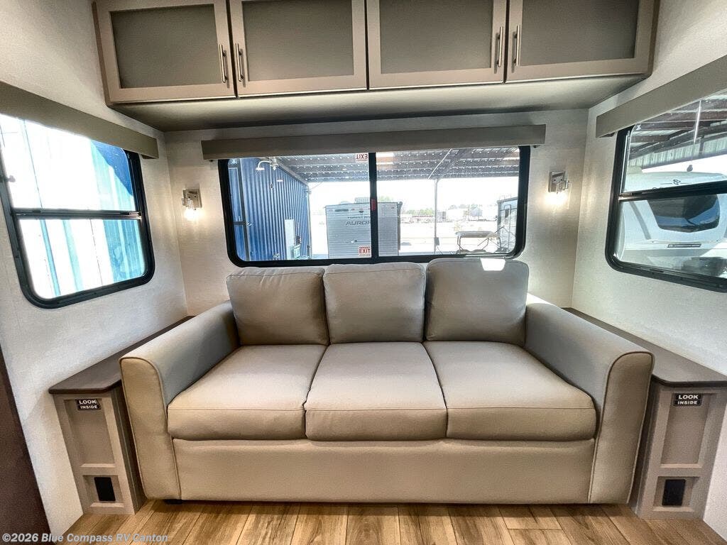 Perfect for families, couples, and travelers who crave space and style. The heart of this fifth wheel is the spacious living area, featuring a tri-fold sleeper sofa that's perfect for lounging and sleeping. Gather around the table with chairs and a bench for meals or socializing. The kitchen is fully equipped with a kitchen island, pantry, hutch, and overhead cabinets, providing ample storage and counter space. The microwave and 10 cu 12V refrigerator ensure that meal preparation and storage are convenient and easy. The full bathroom offers a private space for personal care, ensuring a comfortable and refreshing experience, and the front bedroom is a peaceful retreat, featuring a queen bed, nightstands, and overhead storage.