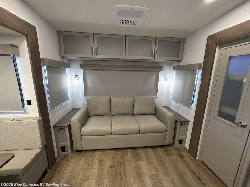Perfect for families, couples, and travelers who crave space and style. The heart of this fifth wheel is the spacious living area, featuring a tri-fold sleeper sofa that's perfect for lounging and sleeping. Gather around the table with chairs and a bench for meals or socializing. The kitchen is fully equipped with a kitchen island, pantry, hutch, and overhead cabinets, providing ample storage and counter space. The microwave and 10 cu 12V refrigerator ensure that meal preparation and storage are convenient and easy. The full bathroom offers a private space for personal care, ensuring a comfortable and refreshing experience, and the front bedroom is a peaceful retreat, featuring a queen bed, nightstands, and overhead storage.