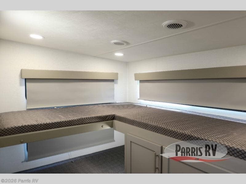 Your kiddos will love this trailer’s rear bunk beds! These bunk beds are perfect for them (or kids at heart!), providing a cozy and comfortable sleeping space. The kitchen is equipped with a refrigerator, microwave, and overhead cabinets, making meal preparation and storage easy. The sink is conveniently located for food prep and cleanup. The L-dinette provide a comfortable spot for meals and socializing. The 68” theater seating is perfect for relaxing and enjoying your favorite shows or movies. The full bathroom provides a private space for personal care, and the front bedroom features a queen bed and nightstands. This serene space is perfect for recharging after a day of adventure!