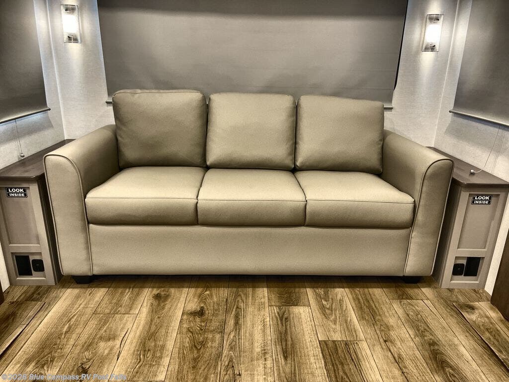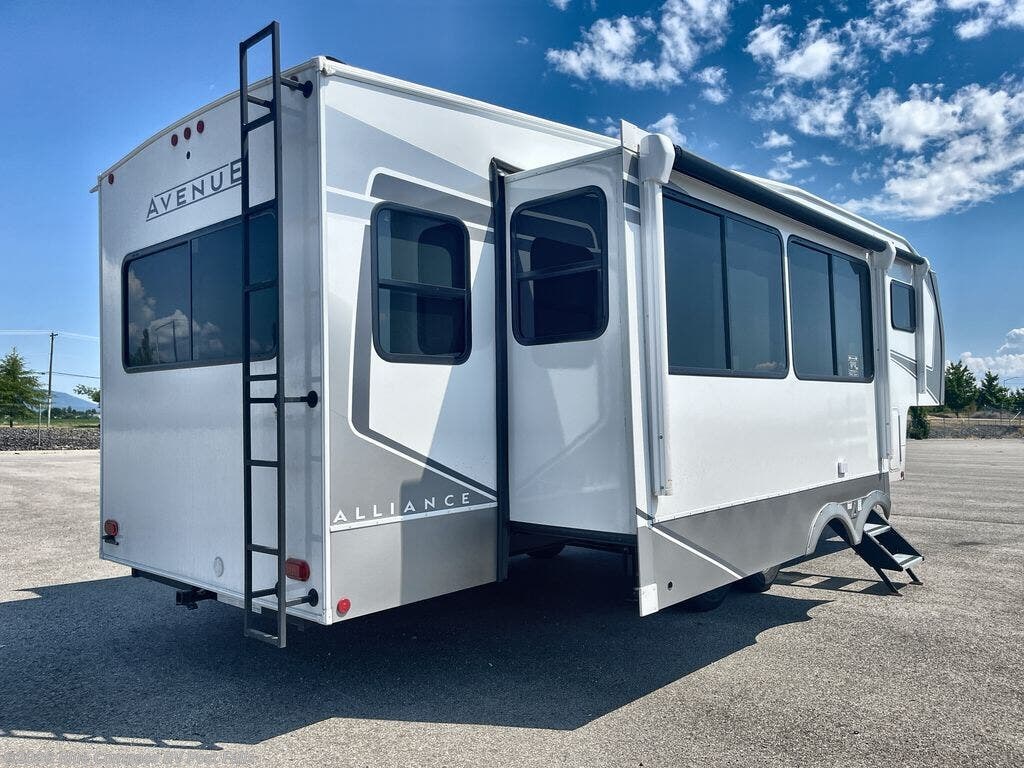 A benchmark chassis creates a space saver upper deck with each one of these Avenue All-Access fifth wheels by Alliance RV! The 101 in. wide-body construction gives you more room to walk around and the flush slide out floors throughout prevent any tripping. There are Azdel composite sidewalls inside and out, and a seamless fully walkable PVC roof for extreme durability and zero maintenance. You are sure to love no carpet throughout making each Avenue All-Access easy to clean and allergen free, not to mention pet friendly. You can maximize your space throughout with innovative storage solutions like the hidden storage behind the TV, inside the end tables, ottoman, and dinette chairs. These units also include the OTG Solar Package with a 200 watt solar panel, 15 amp MPPT charger, multiple outlets, and more to keep you powered up!