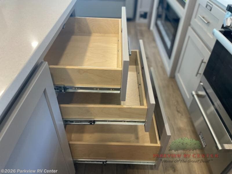 For the couple that enjoys adventures, this rear living coach has everything you need to travel comfortably and take along a couple of friends! The front private bedroom has a queen bed with nightstands on either side for your personal belongings, and a wardrobe to keep your clothes looking nice. Freshen up each morning in the full bathroom with a 30" x 36" shower, and grab a towel stored close by in the linen closet. Now that you're ready for the day, you can head to the kitchen and create a hearty breakfast with the full kitchen amenities. You will appreciate having a 10 cu. ft. 12V refrigerator and three burner cooktop, plus there is a center island with plenty of counter space and a sink to make food prep even easier. Spend your evenings in true relaxation in the dual recliner theater seats across from the swing mount 50" HDTV with hidden storage behind. You will also love the pantry and hutch in the kitchen area for storing all of your dishes and non-perishables. Dine at the floating table with two chairs along with a moveable ottoman featuring storage.
