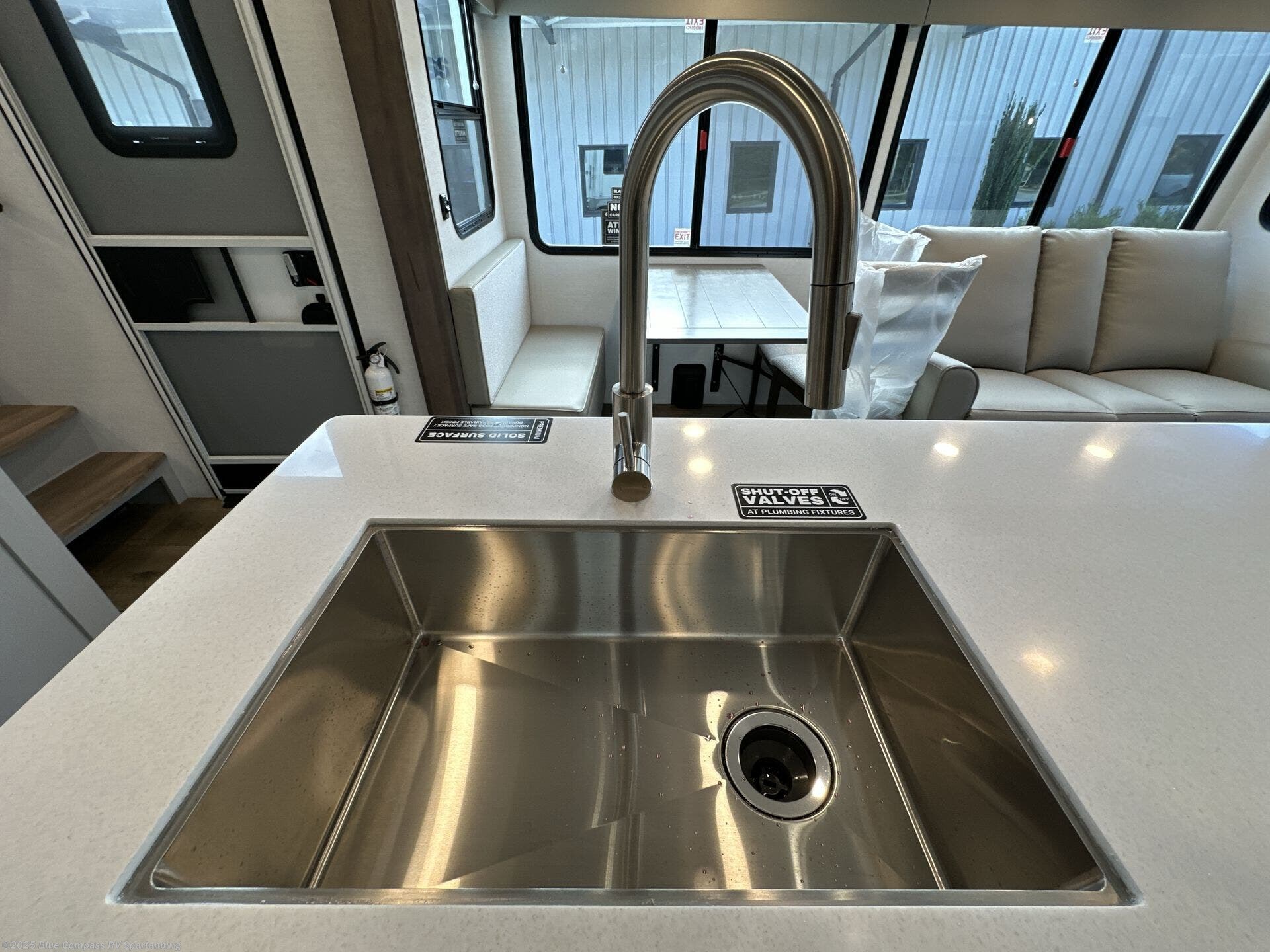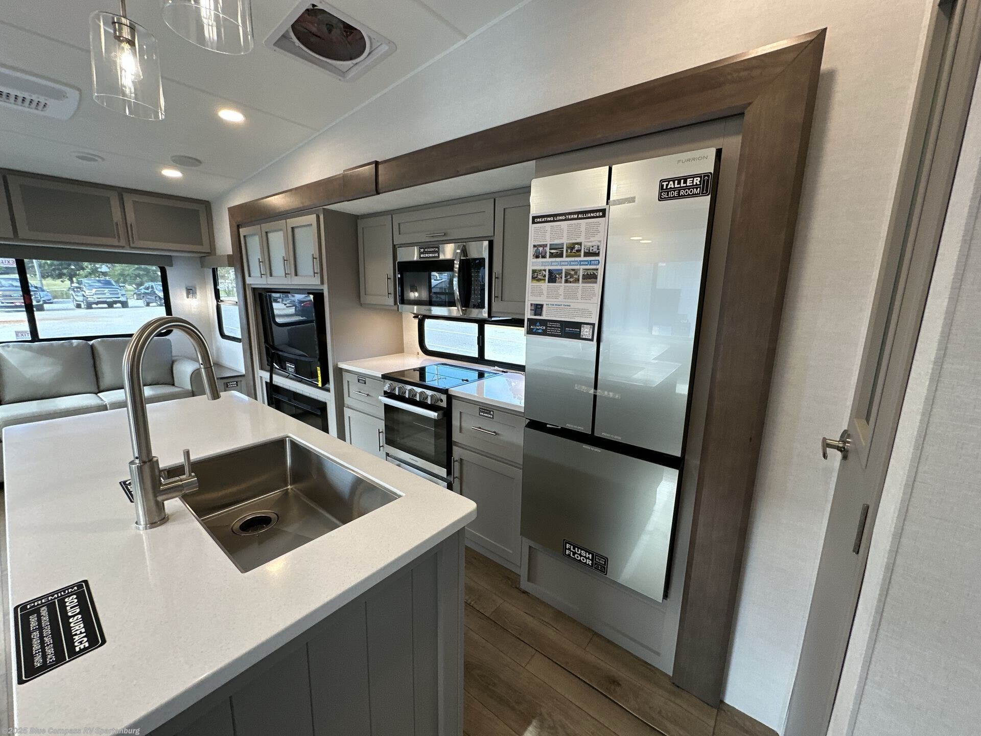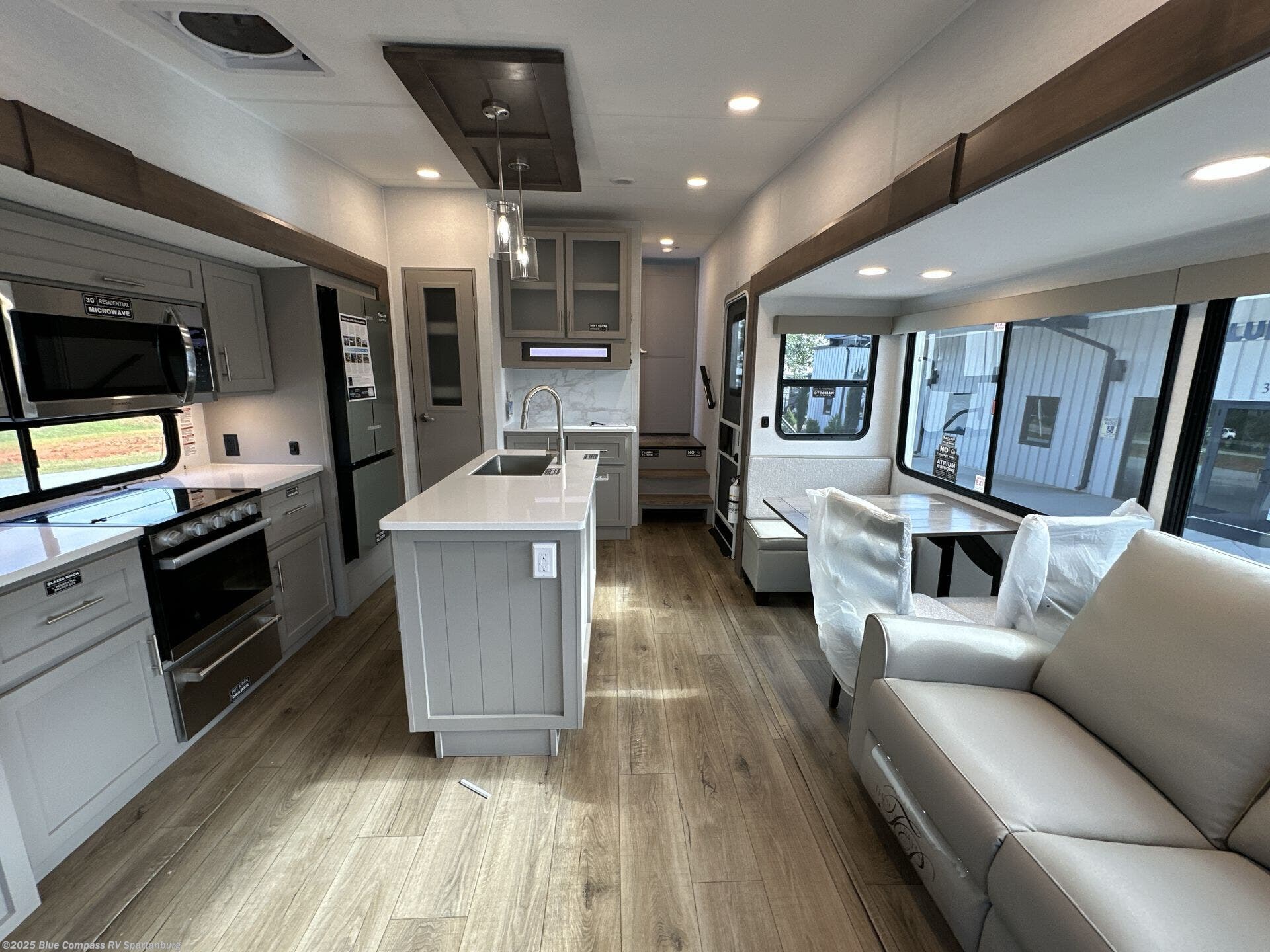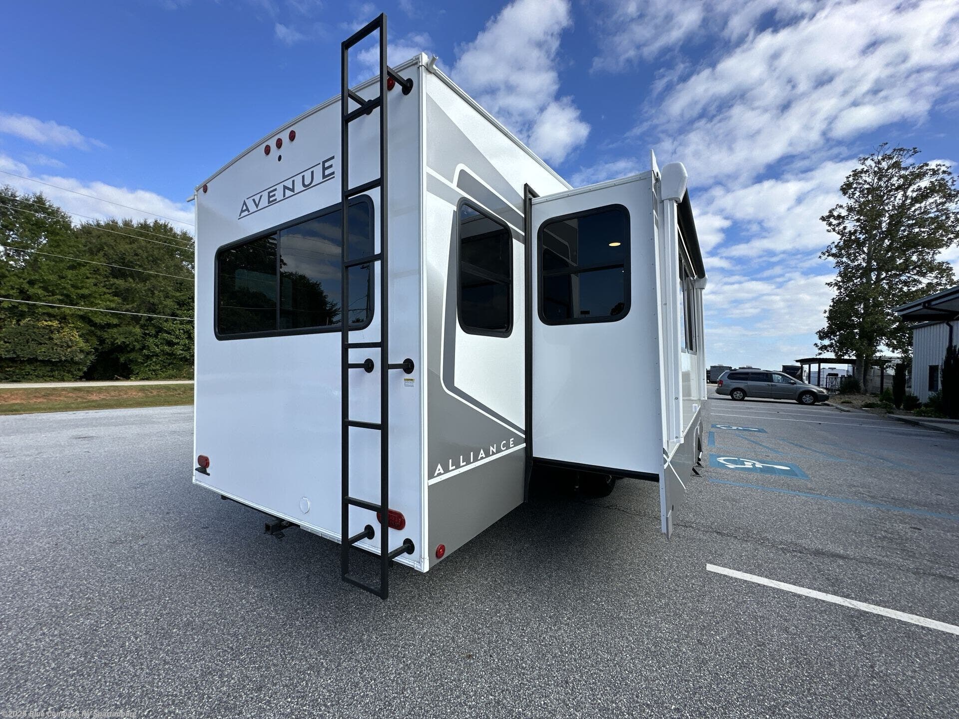 A benchmark chassis creates a space saver upper deck with each one of these Avenue All-Access fifth wheels by Alliance RV! The 101 in. wide-body construction gives you more room to walk around and the flush slide out floors throughout prevent any tripping. There are Azdel composite sidewalls inside and out, and a seamless fully walkable PVC roof for extreme durability and zero maintenance. You are sure to love no carpet throughout making each Avenue All-Access easy to clean and allergen free, not to mention pet friendly. You can maximize your space throughout with innovative storage solutions like the hidden storage behind the TV, inside the end tables, ottoman, and dinette chairs. These units also include the OTG Solar Package with a 200 watt solar panel, 15 amp MPPT charger, multiple outlets, and more to keep you powered up!
