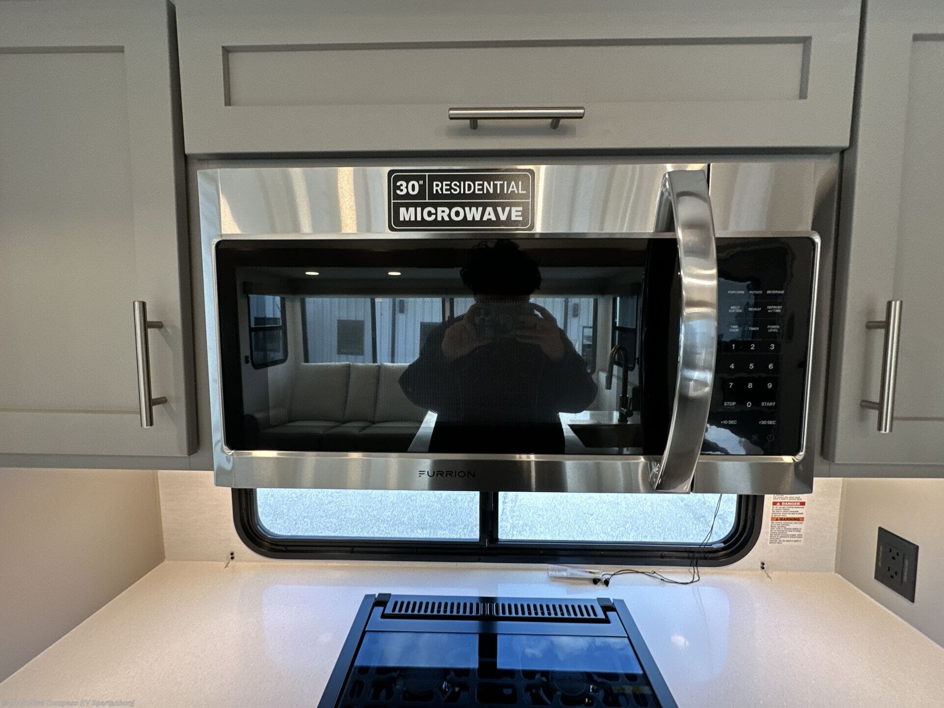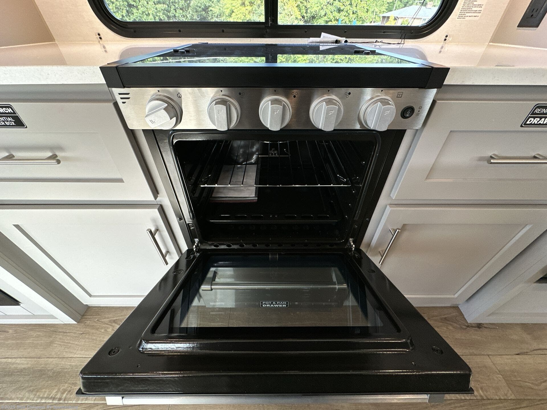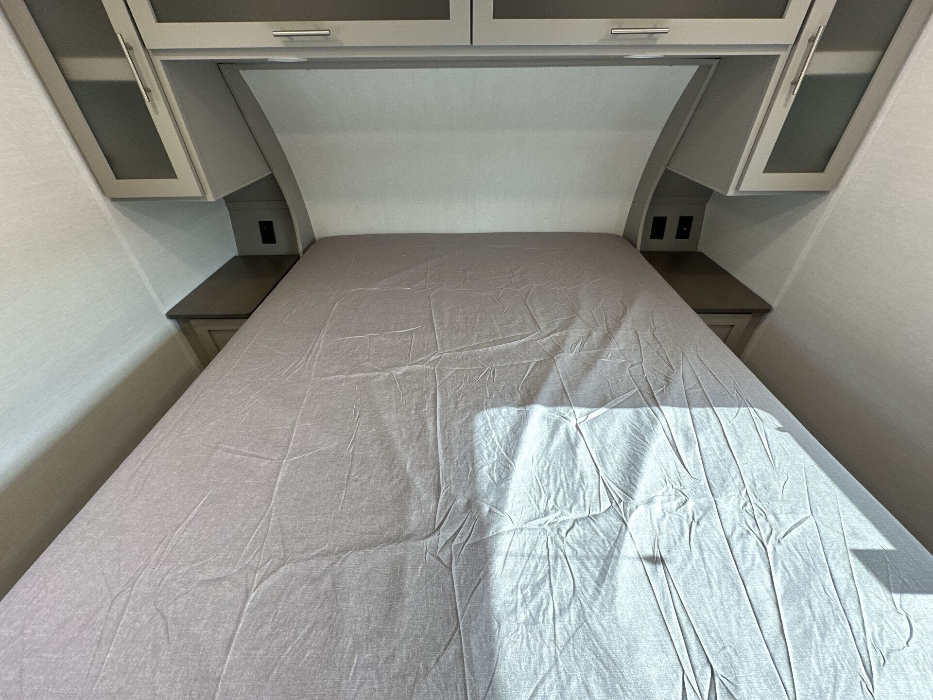 For the couple that enjoys adventures, this rear living coach has everything you need to travel comfortably and take along a couple of friends! The front private bedroom has a queen bed with nightstands on either side for your personal belongings, and a wardrobe to keep your clothes looking nice. Freshen up each morning in the full bathroom with a 30" x 36" shower, and grab a towel stored close by in the linen closet. Now that you're ready for the day, you can head to the kitchen and create a hearty breakfast with the full kitchen amenities. You will appreciate having a 10 cu. ft. 12V refrigerator and three burner cooktop, plus there is a center island with plenty of counter space and a sink to make food prep even easier. Spend your evenings in true relaxation in the dual recliner theater seats across from the swing mount 50" HDTV with hidden storage behind. You will also love the pantry and hutch in the kitchen area for storing all of your dishes and non-perishables. Dine at the floating table with two chairs along with a moveable ottoman featuring storage.