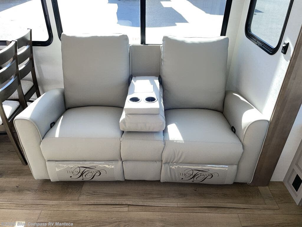 For the couple that enjoys adventures, this rear living coach has everything you need to travel comfortably and take along a couple of friends! The front private bedroom has a queen bed with nightstands on either side for your personal belongings, and a wardrobe to keep your clothes looking nice. Freshen up each morning in the full bathroom with a 30" x 36" shower, and grab a towel stored close by in the linen closet. Now that you're ready for the day, you can head to the kitchen and create a hearty breakfast with the full kitchen amenities. You will appreciate having a 10 cu. ft. 12V refrigerator and three burner cooktop, plus there is a center island with plenty of counter space and a sink to make food prep even easier. Spend your evenings in true relaxation in the dual recliner theater seats across from the swing mount 50" HDTV with hidden storage behind. You will also love the pantry and hutch in the kitchen area for storing all of your dishes and non-perishables. Dine at the floating table with two chairs along with a moveable ottoman featuring storage.
