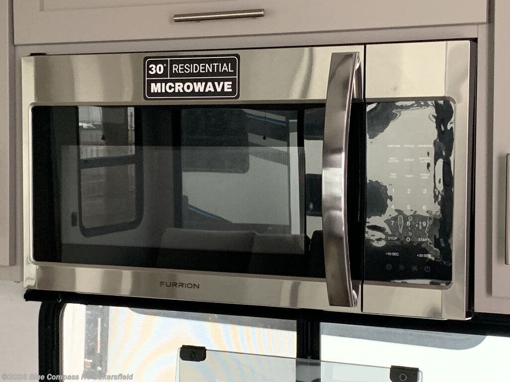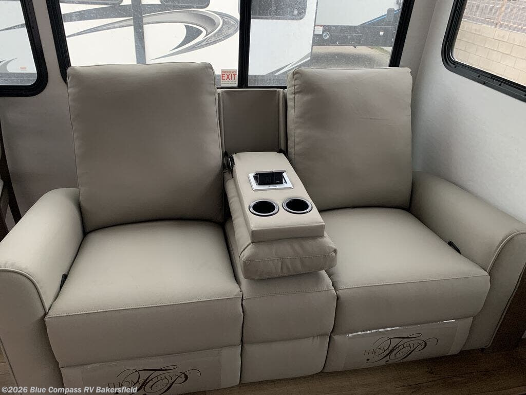 For the couple that enjoys adventures, this rear living coach has everything you need to travel comfortably and take along a couple of friends! The front private bedroom has a queen bed with nightstands on either side for your personal belongings, and a wardrobe to keep your clothes looking nice. Freshen up each morning in the full bathroom with a 30" x 36" shower, and grab a towel stored close by in the linen closet. Now that you're ready for the day, you can head to the kitchen and create a hearty breakfast with the full kitchen amenities. You will appreciate having a 10 cu. ft. 12V refrigerator and three burner cooktop, plus there is a center island with plenty of counter space and a sink to make food prep even easier. Spend your evenings in true relaxation in the dual recliner theater seats across from the swing mount 50" HDTV with hidden storage behind. You will also love the pantry and hutch in the kitchen area for storing all of your dishes and non-perishables. Dine at the floating table with two chairs along with a moveable ottoman featuring storage.