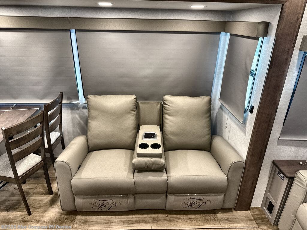 For the couple that enjoys adventures, this rear living coach has everything you need to travel comfortably and take along a couple of friends! The front private bedroom has a queen bed with nightstands on either side for your personal belongings, and a wardrobe to keep your clothes looking nice. Freshen up each morning in the full bathroom with a 30" x 36" shower, and grab a towel stored close by in the linen closet. Now that you're ready for the day, you can head to the kitchen and create a hearty breakfast with the full kitchen amenities. You will appreciate having a 10 cu. ft. 12V refrigerator and three burner cooktop, plus there is a center island with plenty of counter space and a sink to make food prep even easier. Spend your evenings in true relaxation in the dual recliner theater seats across from the swing mount 50" HDTV with hidden storage behind. You will also love the pantry and hutch in the kitchen area for storing all of your dishes and non-perishables. Dine at the floating table with two chairs along with a moveable ottoman featuring storage.