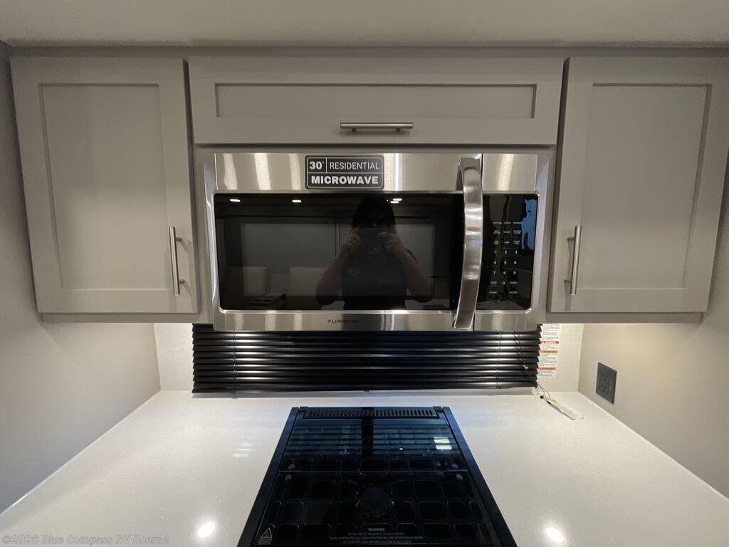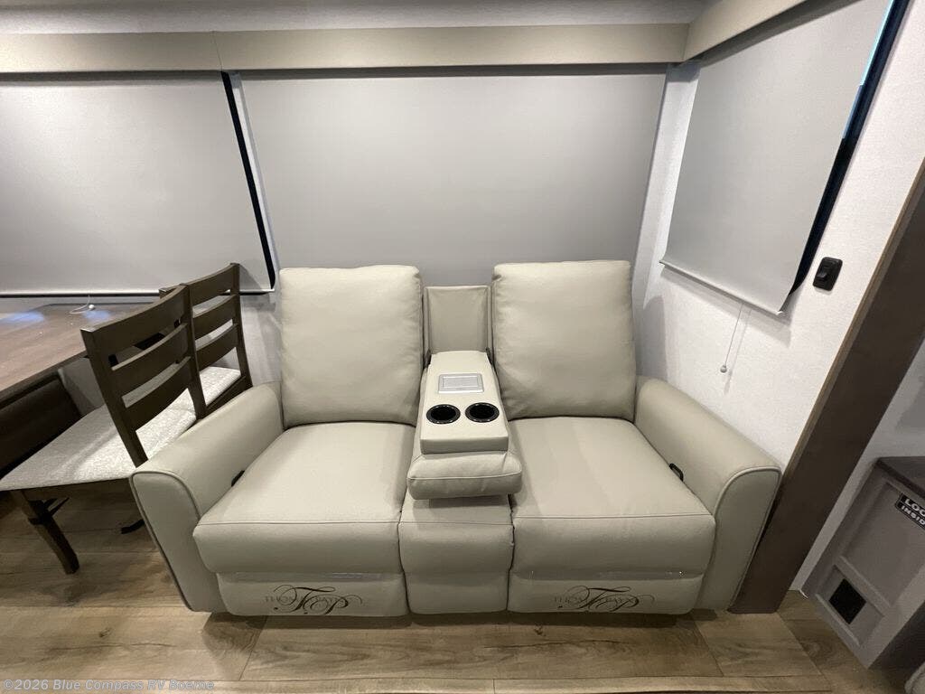For the couple that enjoys adventures, this rear living coach has everything you need to travel comfortably and take along a couple of friends! The front private bedroom has a queen bed with nightstands on either side for your personal belongings, and a wardrobe to keep your clothes looking nice. Freshen up each morning in the full bathroom with a 30" x 36" shower, and grab a towel stored close by in the linen closet. Now that you're ready for the day, you can head to the kitchen and create a hearty breakfast with the full kitchen amenities. You will appreciate having a 10 cu. ft. 12V refrigerator and three burner cooktop, plus there is a center island with plenty of counter space and a sink to make food prep even easier. Spend your evenings in true relaxation in the dual recliner theater seats across from the swing mount 50" HDTV with hidden storage behind. You will also love the pantry and hutch in the kitchen area for storing all of your dishes and non-perishables. Dine at the floating table with two chairs along with a moveable ottoman featuring storage.
