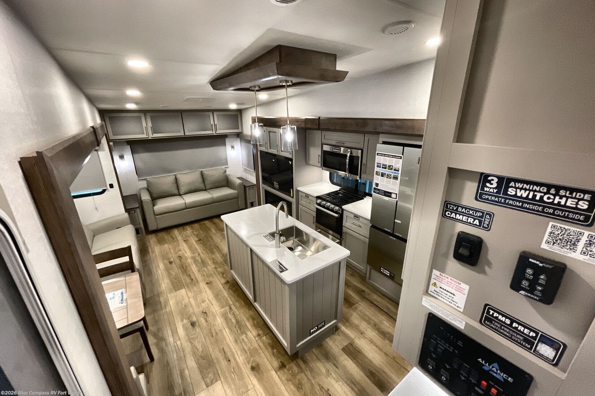A benchmark chassis creates a space saver upper deck with each one of these Avenue All-Access fifth wheels by Alliance RV! The 101 in. wide-body construction gives you more room to walk around and the flush slide out floors throughout prevent any tripping. There are Azdel composite sidewalls inside and out, and a seamless fully walkable PVC roof for extreme durability and zero maintenance. You are sure to love no carpet throughout making each Avenue All-Access easy to clean and allergen free, not to mention pet friendly. You can maximize your space throughout with innovative storage solutions like the hidden storage behind the TV, inside the end tables, ottoman, and dinette chairs. These units also include the OTG Solar Package with a 200 watt solar panel, 15 amp MPPT charger, multiple outlets, and more to keep you powered up!