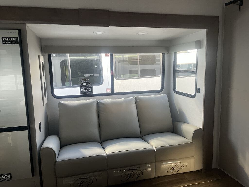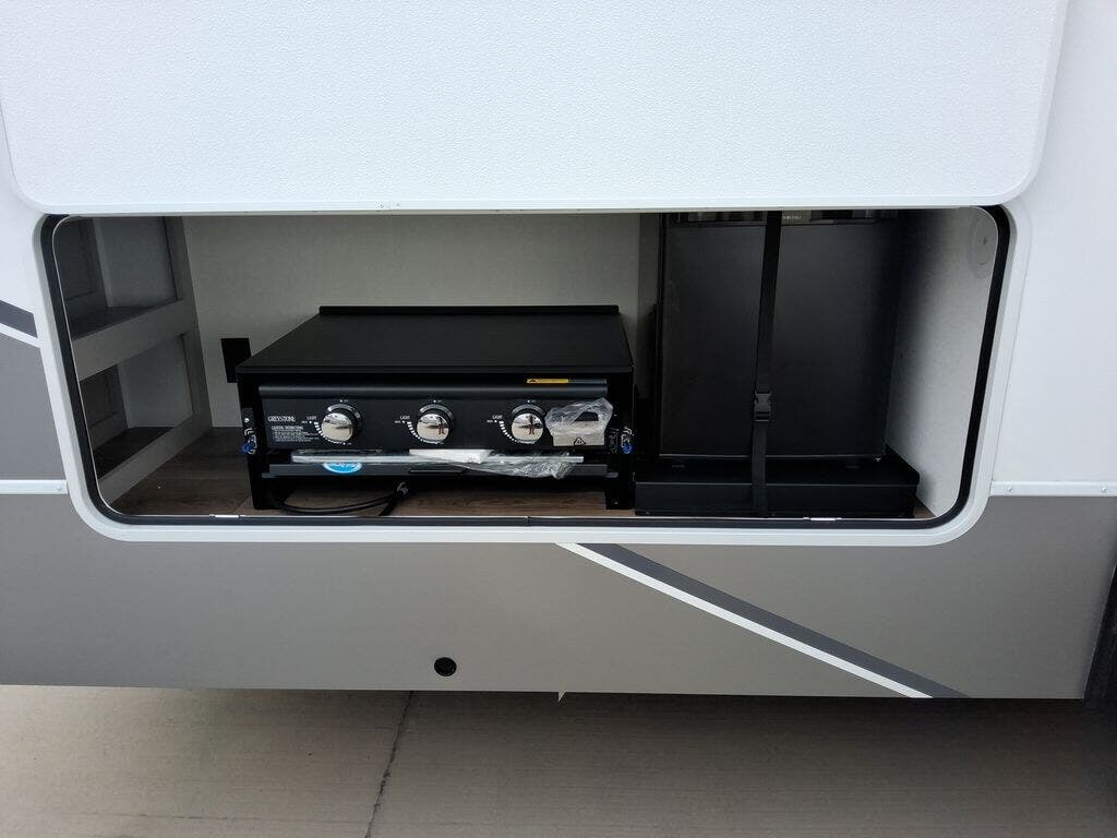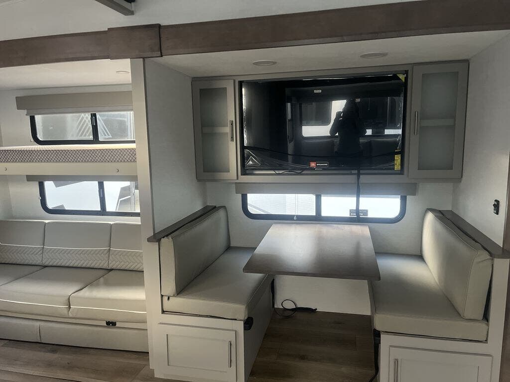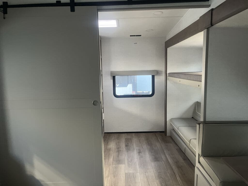 If you've been searching for a fifth wheel with more sleeping space, this is the one! You will find a queen bed in the front private bedroom, along with a wardrobe with washer and dryer prep and overhead storage for your things. Your guests can take the rear bunkhouse that includes 40" x 72" bunks across from a slide out with a flip-up bunk and cube sofa below. Everyone can meet in the middle living area and kitchen to relax on the sofa that is in direct view of the 50" Class HDTV. There is also a booth dinette table here to dine together. If the weather is nice, you may just find yourselves outdoors since there are two awnings and an exterior griddle!