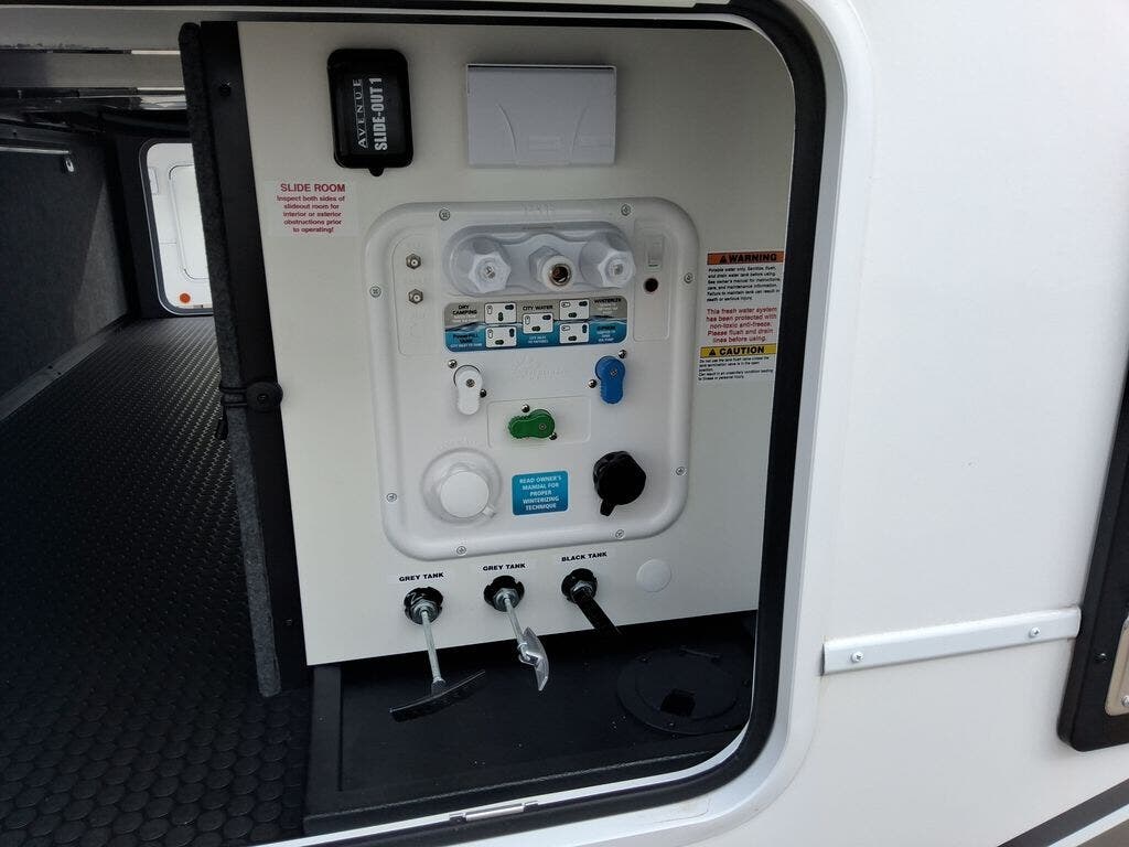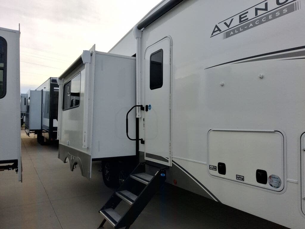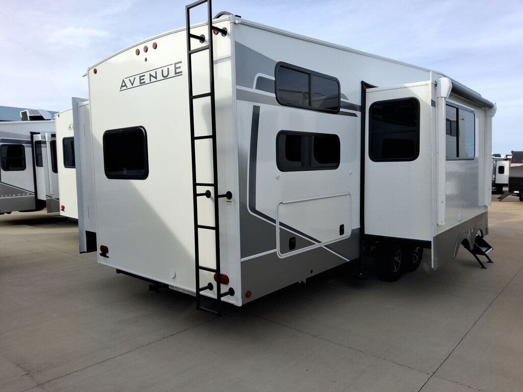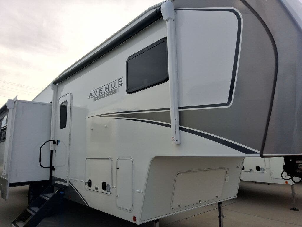 A benchmark chassis creates a space saver upper deck with each one of these Avenue All-Access fifth wheels by Alliance RV! The 101 in. wide-body construction gives you more room to walk around and the flush slide out floors throughout prevent any tripping. There are Azdel composite sidewalls inside and out, and a seamless fully walkable PVC roof for extreme durability and zero maintenance. You are sure to love no carpet throughout making each Avenue All-Access easy to clean and allergen free, not to mention pet friendly. You can maximize your space throughout with innovative storage solutions like the hidden storage behind the TV, inside the end tables, ottoman, and dinette chairs. These units also include the OTG Solar Package with a 200 watt solar panel, 15 amp MPPT charger, multiple outlets, and more to keep you powered up!