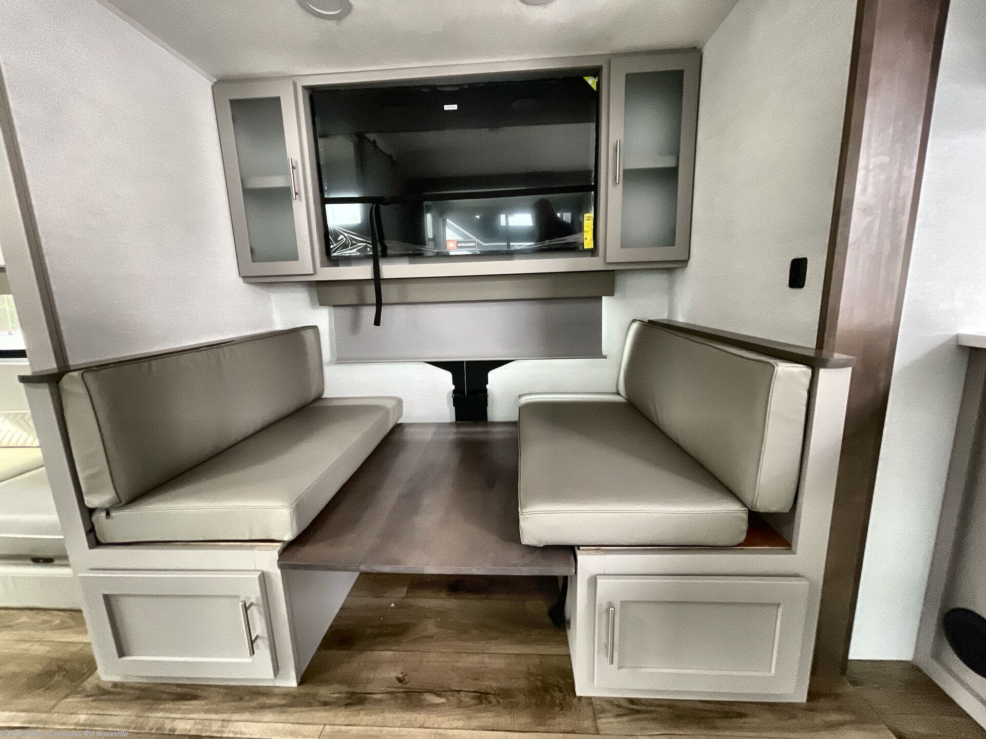 If you've been searching for a fifth wheel with more sleeping space, this is the one! You will find a queen bed in the front private bedroom, along with a wardrobe with washer and dryer prep and overhead storage for your things. Your guests can take the rear bunkhouse that includes 40" x 72" bunks across from a slide out with a flip-up bunk and cube sofa below. Everyone can meet in the middle living area and kitchen to relax on the sofa that is in direct view of the 50" Class HDTV. There is also a booth dinette table here to dine together. If the weather is nice, you may just find yourselves outdoors since there are two awnings and an exterior griddle!