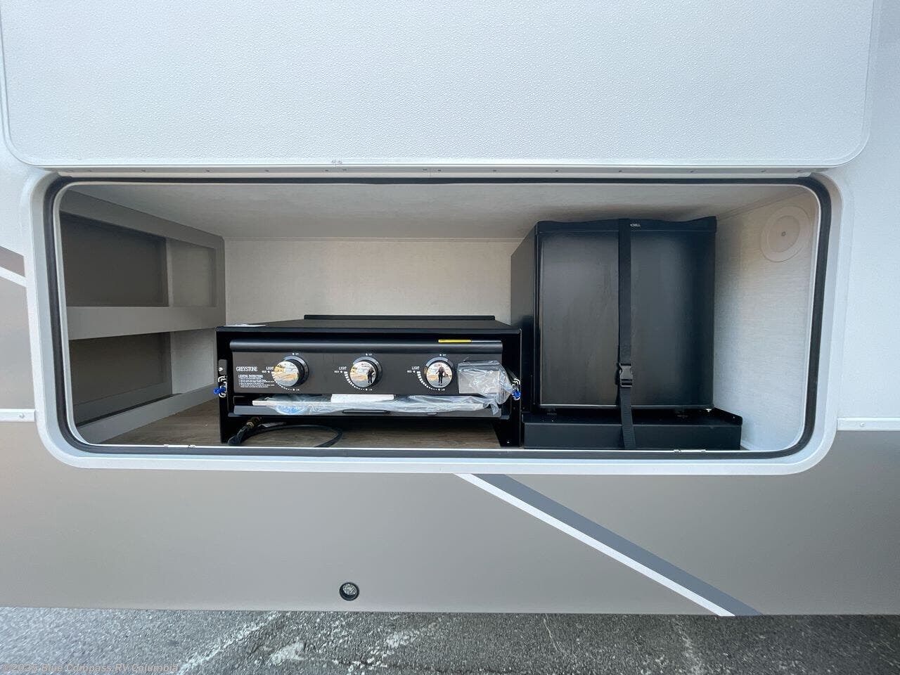 If you've been searching for a fifth wheel with more sleeping space, this is the one! You will find a queen bed in the front private bedroom, along with a wardrobe with washer and dryer prep and overhead storage for your things. Your guests can take the rear bunkhouse that includes 40" x 72" bunks across from a slide out with a flip-up bunk and cube sofa below. Everyone can meet in the middle living area and kitchen to relax on the sofa that is in direct view of the 50" Class HDTV. There is also a booth dinette table here to dine together. If the weather is nice, you may just find yourselves outdoors since there are two awnings and an exterior griddle!