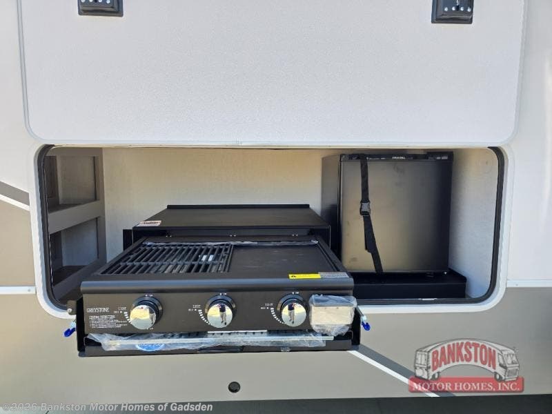 If you've been searching for a fifth wheel with more sleeping space, this is the one! You will find a queen bed in the front private bedroom, along with a wardrobe with washer and dryer prep and overhead storage for your things. Your guests can take the rear bunkhouse that includes 40" x 72" bunks across from a slide out with a flip-up bunk and cube sofa below. Everyone can meet in the middle living area and kitchen to relax on the sofa that is in direct view of the 50" Class HDTV. There is also a booth dinette table here to dine together. If the weather is nice, you may just find yourselves outdoors since there are two awnings and an exterior griddle!