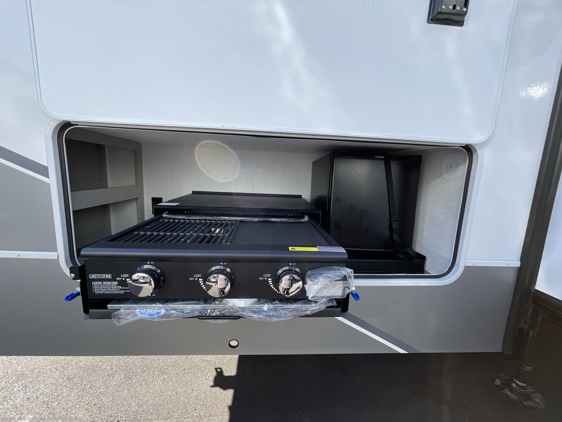 If you've been searching for a fifth wheel with more sleeping space, this is the one! You will find a queen bed in the front private bedroom, along with a wardrobe with washer and dryer prep and overhead storage for your things. Your guests can take the rear bunkhouse that includes 40" x 72" bunks across from a slide out with a flip-up bunk and cube sofa below. Everyone can meet in the middle living area and kitchen to relax on the sofa that is in direct view of the 50" Class HDTV. There is also a booth dinette table here to dine together. If the weather is nice, you may just find yourselves outdoors since there are two awnings and an exterior griddle!