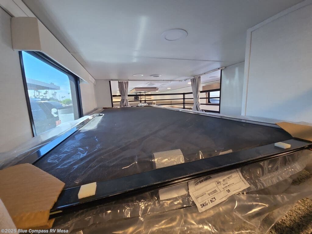 This destination trailer with a loft will be a favorite with the little ones! They will have three bunk mats to choose from plus wardrobes to keep their things picked up. You can take the rear private bedroom that includes a power tilting king bed that will allow you to sit up in bed at night to read. There is also a wardrobe, a dresser with a 32" TV, and a stackable washer and dryer to make laundry day easier than ever. A full bath with a 48" x 30" shower will let you freshen up each day, and there is a linen closet to keep clean towels close by. Everyone will enjoy spending time together in the front living area that includes a two dual recliner theater seats, a 50" TV and fireplace, and hidden storage for games or books. The chef of your group can make meals each day on the residential range and microwave, and there is a 110V Samsung refrigerator to keep your food fresh.