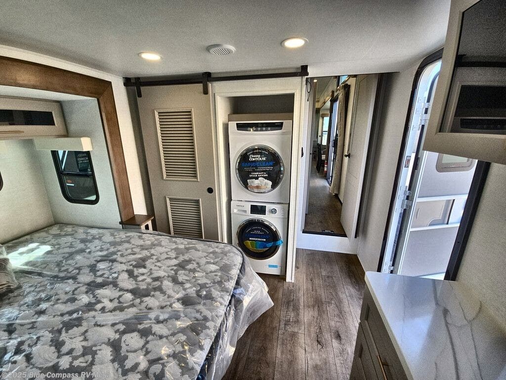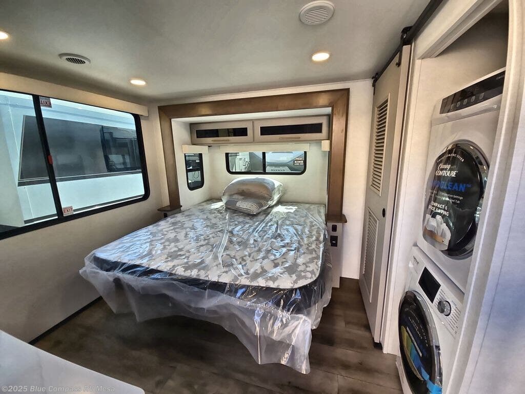 With any Benchmark destination trailer by Alliance RV, you will enjoy luxury features at every turn! The high gloss fiberglass exterior is ultra sleek, and the Azdel composite fiberglass sidewalls add durability so you can camp for years to come. You'll also find a residential exterior garden hose connection outside, along with a powder coated aluminum rear ladder, and an auxiliary LP tank hook up if you want to bring your grill along. Head inside to find hardwood cabinetry, solid surface countertops throughout, oversized windows in all rooms, and MCD roller shades throughout. The 45,000 BTU A/C and 60,000 BTU furnace will keep you comfortable year around, and there is a stackable washer and dryer to make full-time RV living easier than ever!