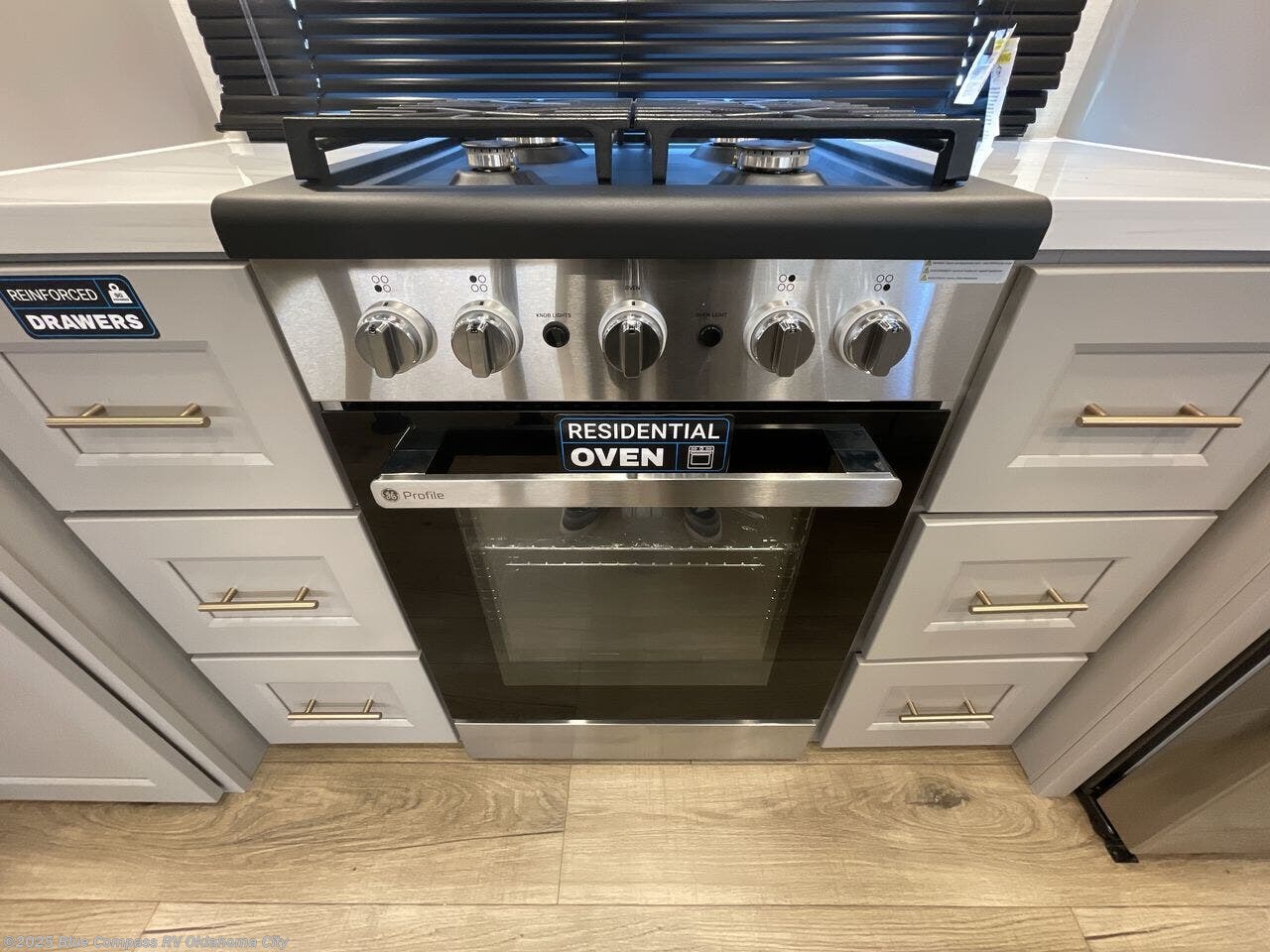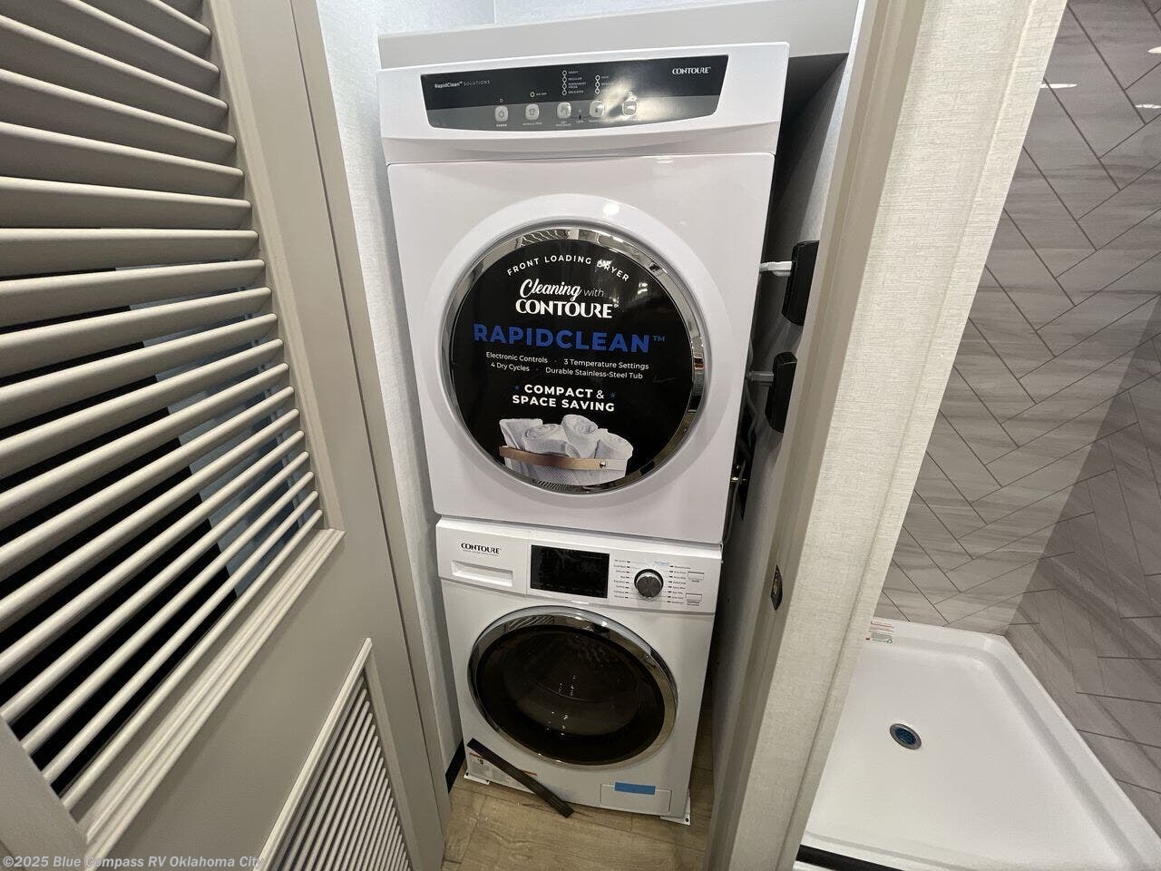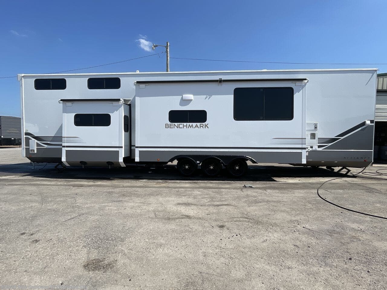 With any Benchmark destination trailer by Alliance RV, you will enjoy luxury features at every turn! The high gloss fiberglass exterior is ultra sleek, and the Azdel composite fiberglass sidewalls add durability so you can camp for years to come. You'll also find a residential exterior garden hose connection outside, along with a powder coated aluminum rear ladder, and an auxiliary LP tank hook up if you want to bring your grill along. Head inside to find hardwood cabinetry, solid surface countertops throughout, oversized windows in all rooms, and MCD roller shades throughout. The 45,000 BTU A/C and 60,000 BTU furnace will keep you comfortable year around, and there is a stackable washer and dryer to make full-time RV living easier than ever!