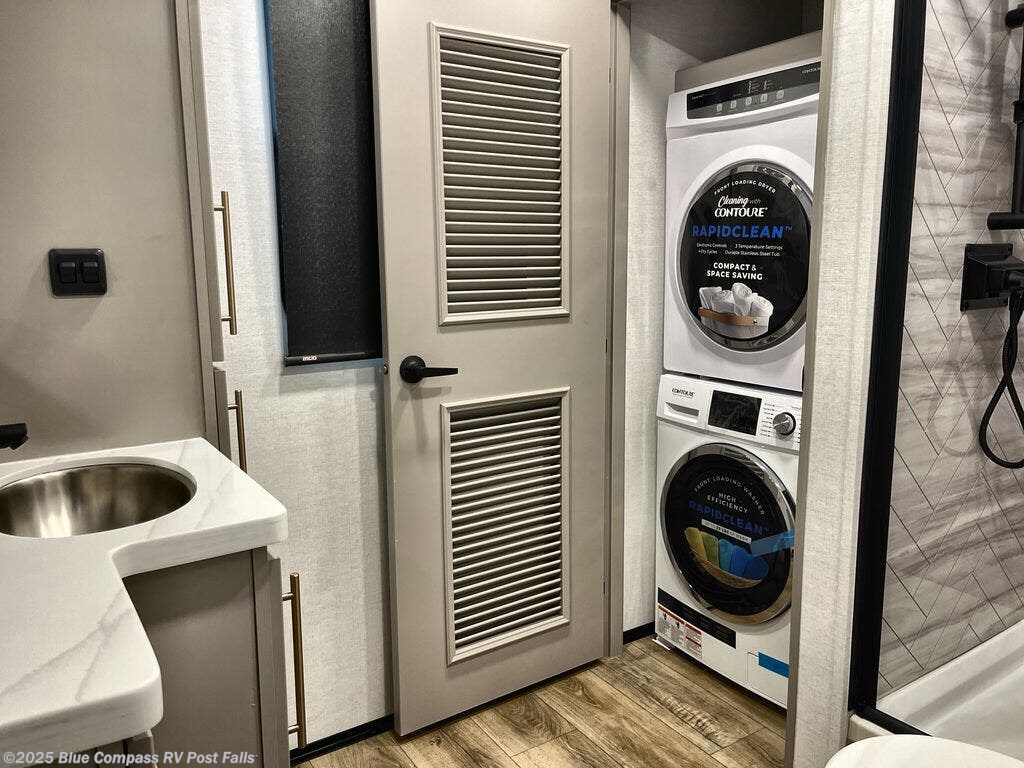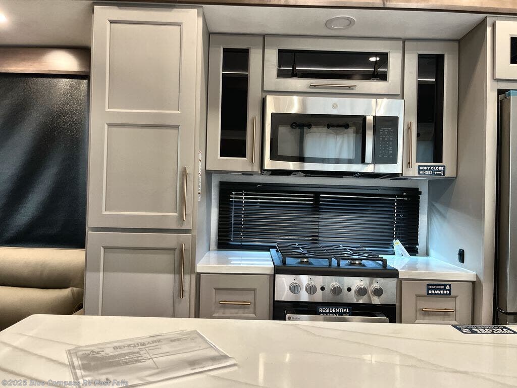 With any Benchmark destination trailer by Alliance RV, you will enjoy luxury features at every turn! The high gloss fiberglass exterior is ultra sleek, and the Azdel composite fiberglass sidewalls add durability so you can camp for years to come. You'll also find a residential exterior garden hose connection outside, along with a powder coated aluminum rear ladder, and an auxiliary LP tank hook up if you want to bring your grill along. Head inside to find hardwood cabinetry, solid surface countertops throughout, oversized windows in all rooms, and MCD roller shades throughout. The 45,000 BTU A/C and 60,000 BTU furnace will keep you comfortable year around, and there is a stackable washer and dryer to make full-time RV living easier than ever!