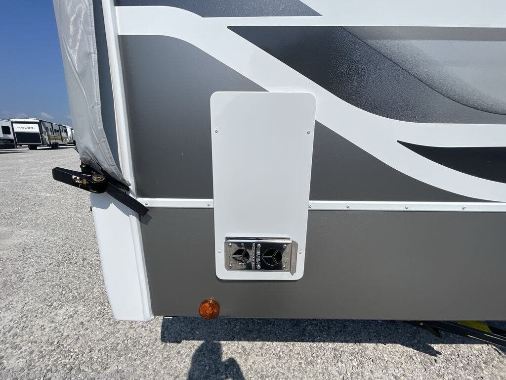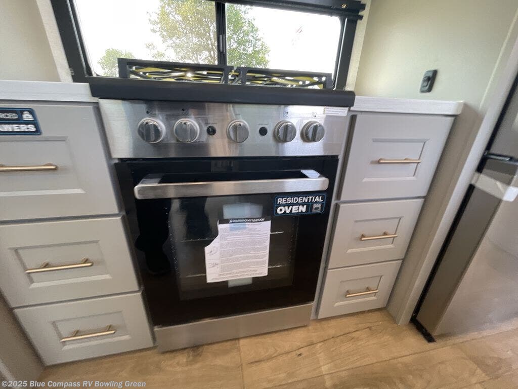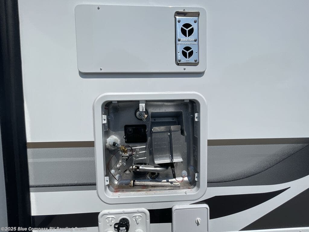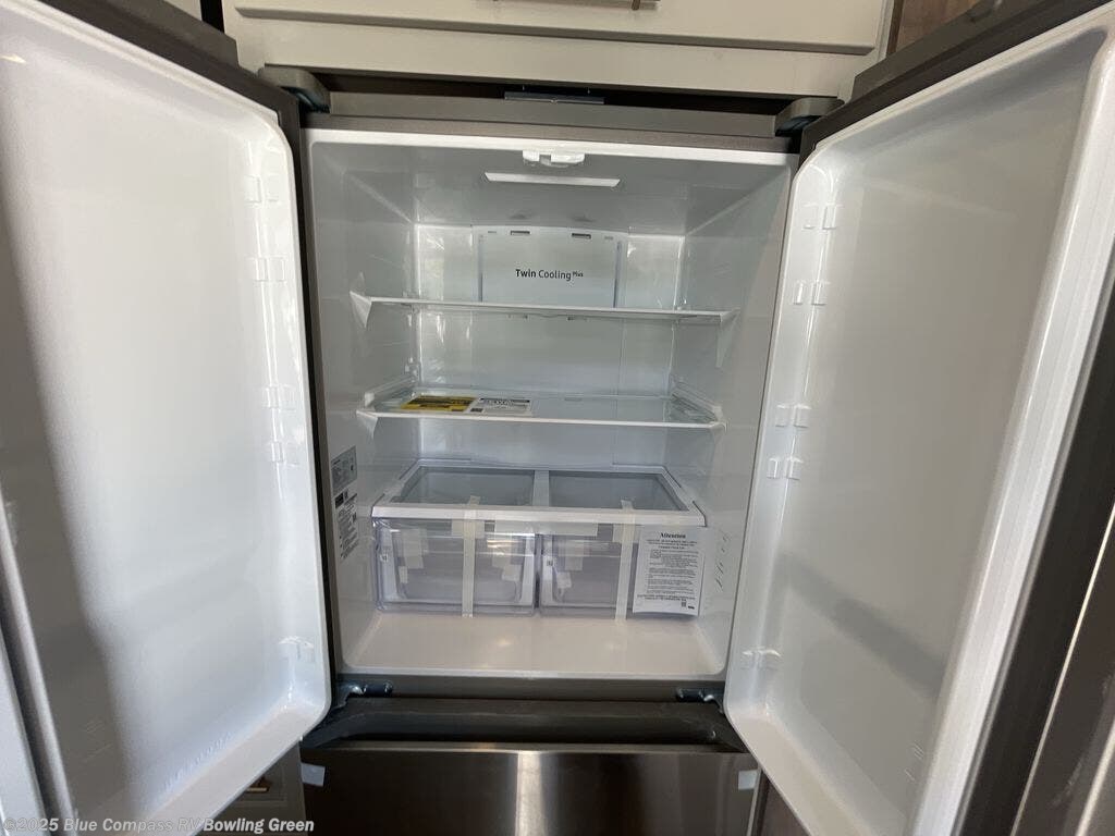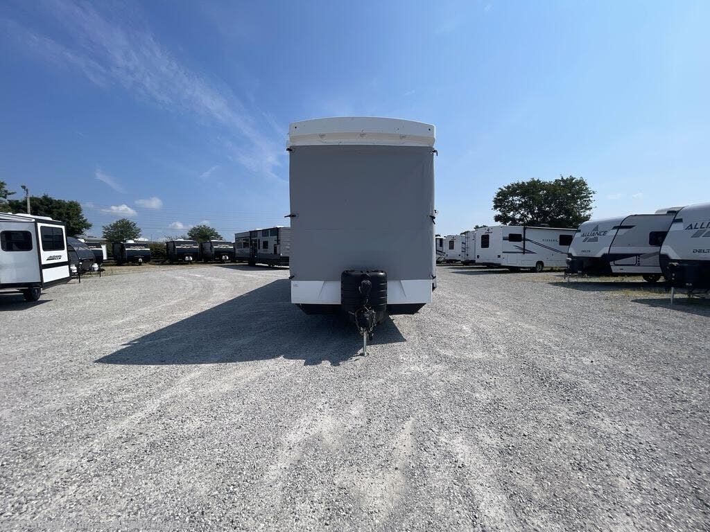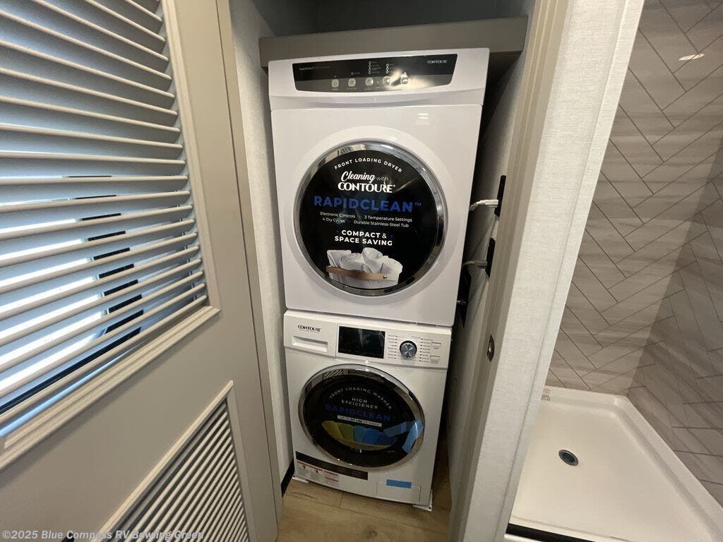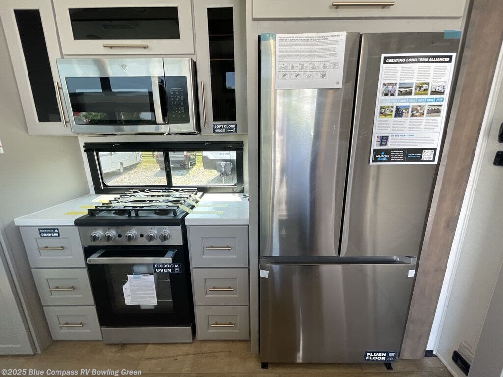 With any Benchmark destination trailer by Alliance RV, you will enjoy luxury features at every turn! The high gloss fiberglass exterior is ultra sleek, and the Azdel composite fiberglass sidewalls add durability so you can camp for years to come. You'll also find a residential exterior garden hose connection outside, along with a powder coated aluminum rear ladder, and an auxiliary LP tank hook up if you want to bring your grill along. Head inside to find hardwood cabinetry, solid surface countertops throughout, oversized windows in all rooms, and MCD roller shades throughout. The 45,000 BTU A/C and 60,000 BTU furnace will keep you comfortable year around, and there is a stackable washer and dryer to make full-time RV living easier than ever!