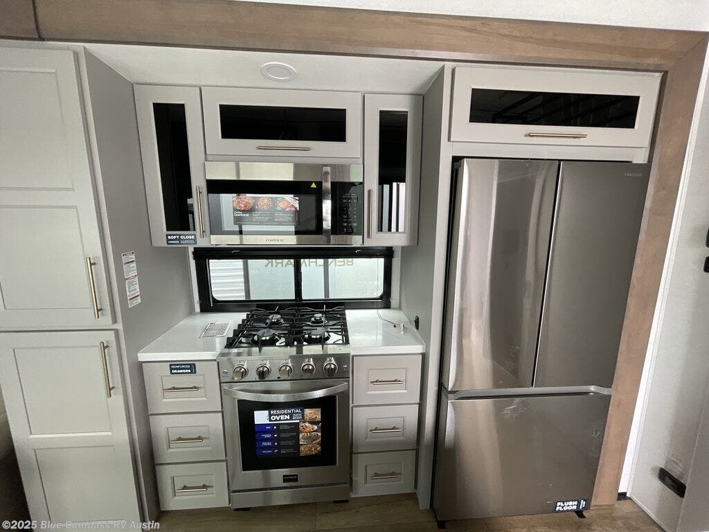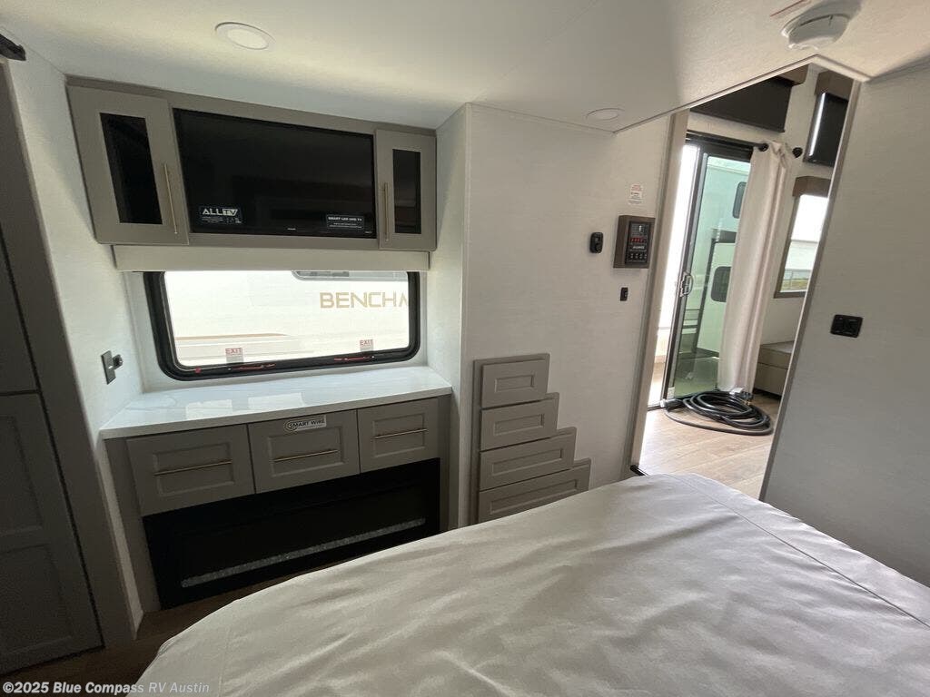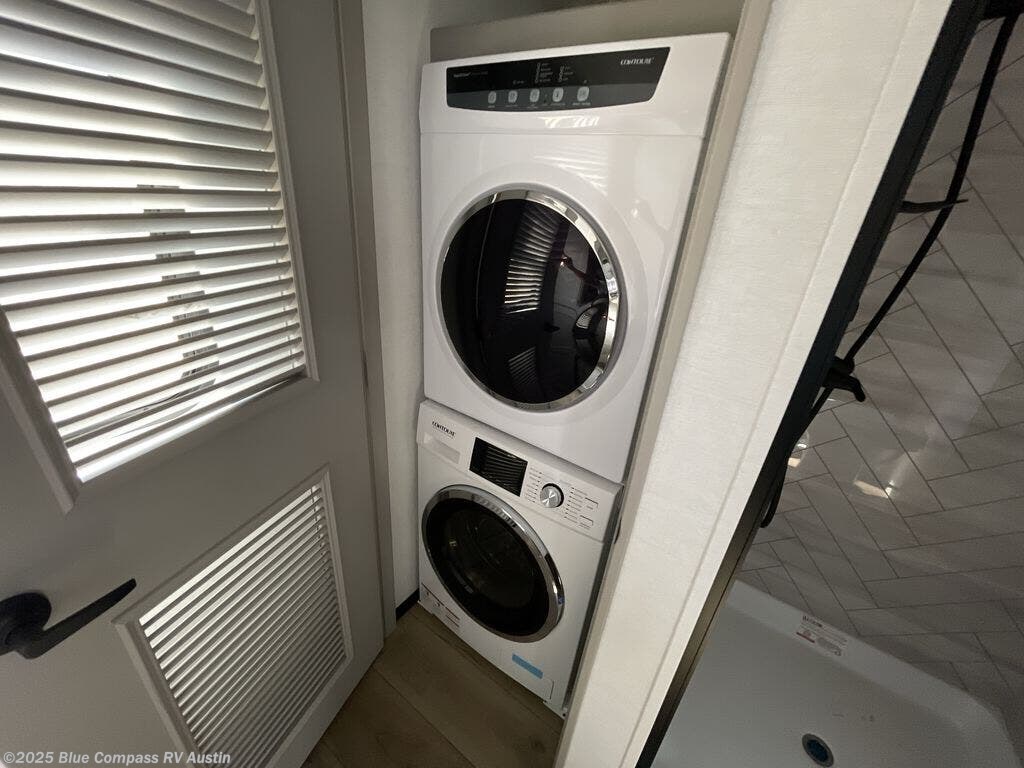 With any Benchmark destination trailer by Alliance RV, you will enjoy luxury features at every turn! The high gloss fiberglass exterior is ultra sleek, and the Azdel composite fiberglass sidewalls add durability so you can camp for years to come. You'll also find a residential exterior garden hose connection outside, along with a powder coated aluminum rear ladder, and an auxiliary LP tank hook up if you want to bring your grill along. Head inside to find hardwood cabinetry, solid surface countertops throughout, oversized windows in all rooms, and MCD roller shades throughout. The 45,000 BTU A/C and 60,000 BTU furnace will keep you comfortable year around, and there is a stackable washer and dryer to make full-time RV living easier than ever!