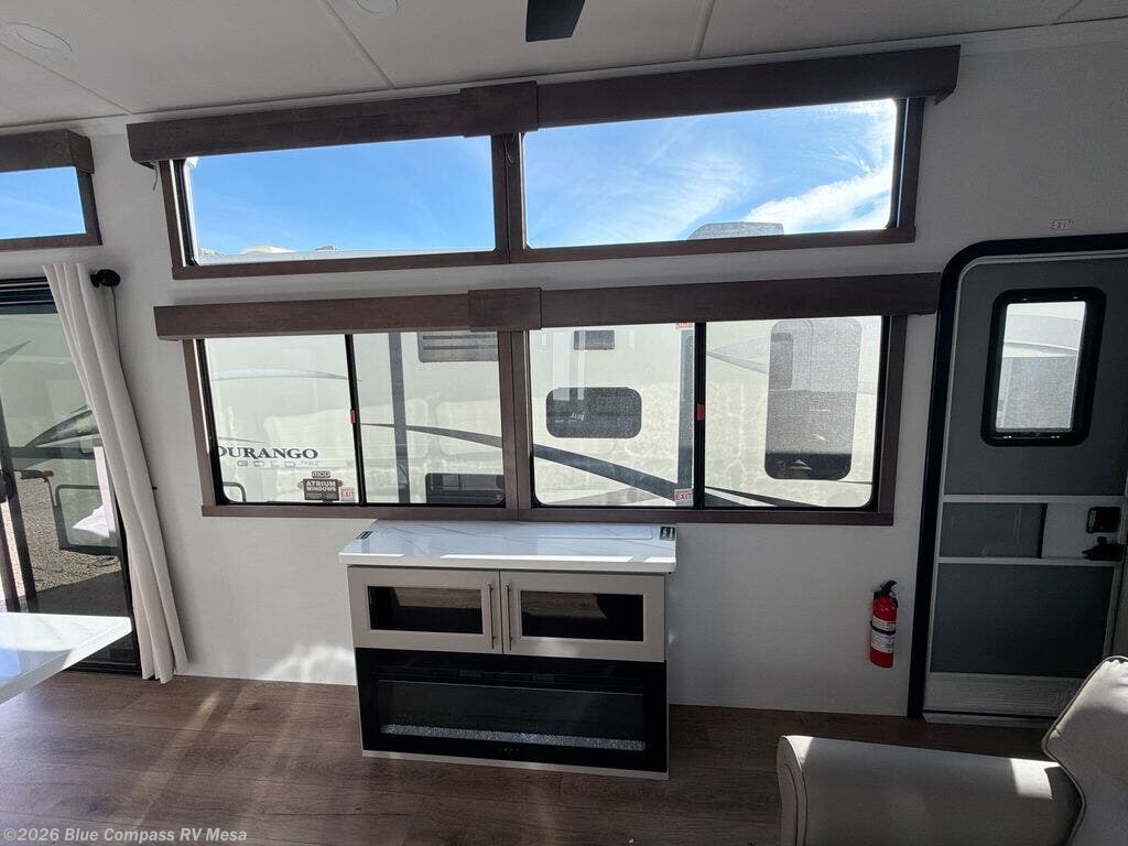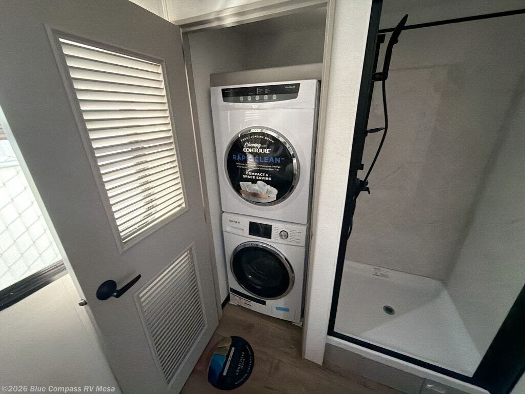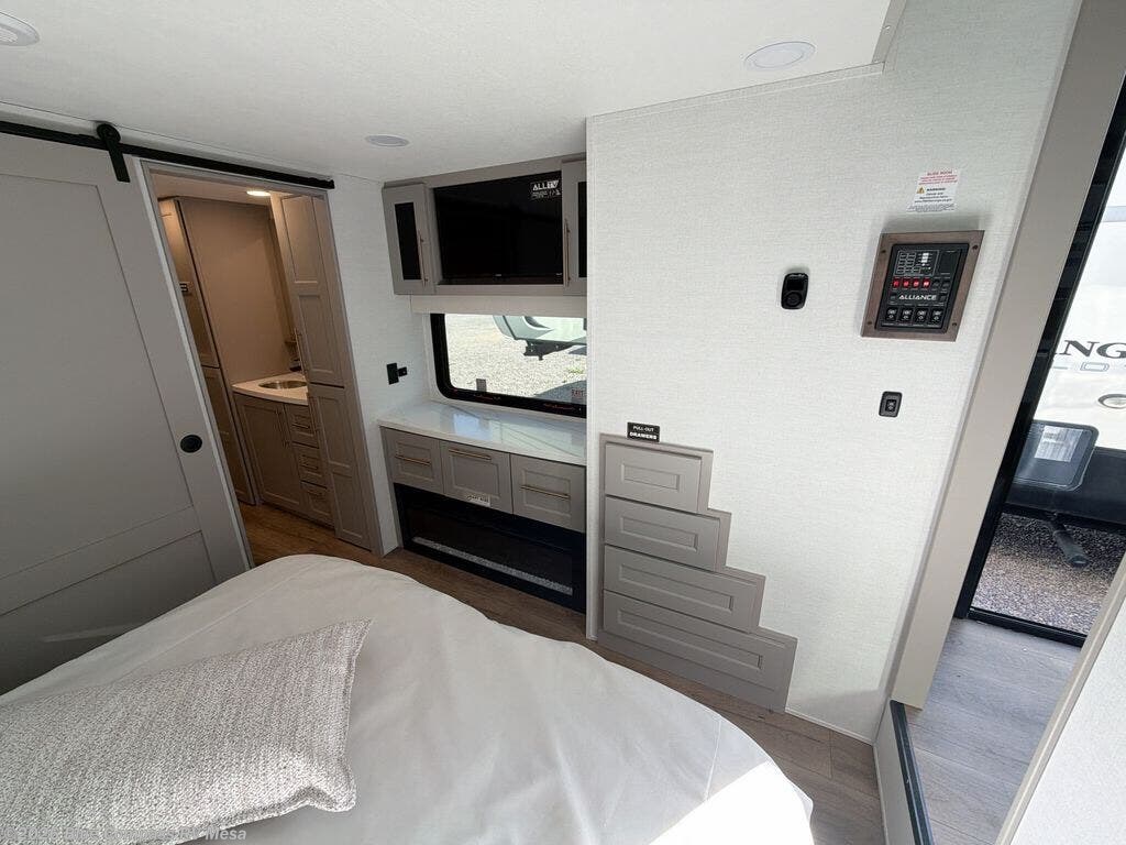 With any Benchmark destination trailer by Alliance RV, you will enjoy luxury features at every turn! The high gloss fiberglass exterior is ultra sleek, and the Azdel composite fiberglass sidewalls add durability so you can camp for years to come. You'll also find a residential exterior garden hose connection outside, along with a powder coated aluminum rear ladder, and an auxiliary LP tank hook up if you want to bring your grill along. Head inside to find hardwood cabinetry, solid surface countertops throughout, oversized windows in all rooms, and MCD roller shades throughout. The 45,000 BTU A/C and 60,000 BTU furnace will keep you comfortable year around, and there is a stackable washer and dryer to make full-time RV living easier than ever!