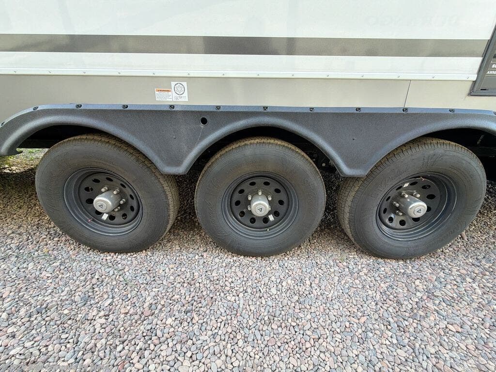 This destination trailer is perfect for a big crowd since it has one Power Tilting king bed, three mattress and an L- shape sofa. Experience the in-home feeling with the amazing kitchen and living room, furnished with a Kitchen island, L- shape sofa and a residential 110 V fridge. Also, you can sense the extreme coziness thanks to the dual fire places and get 24/7 entertainment due to the four TVs along the trailer. Plenty of place can be found in the front and rear loft bedrooms with three wardrobes in total. Lastly the two full bathrooms will allow you to comfortably take a shower after a long day.