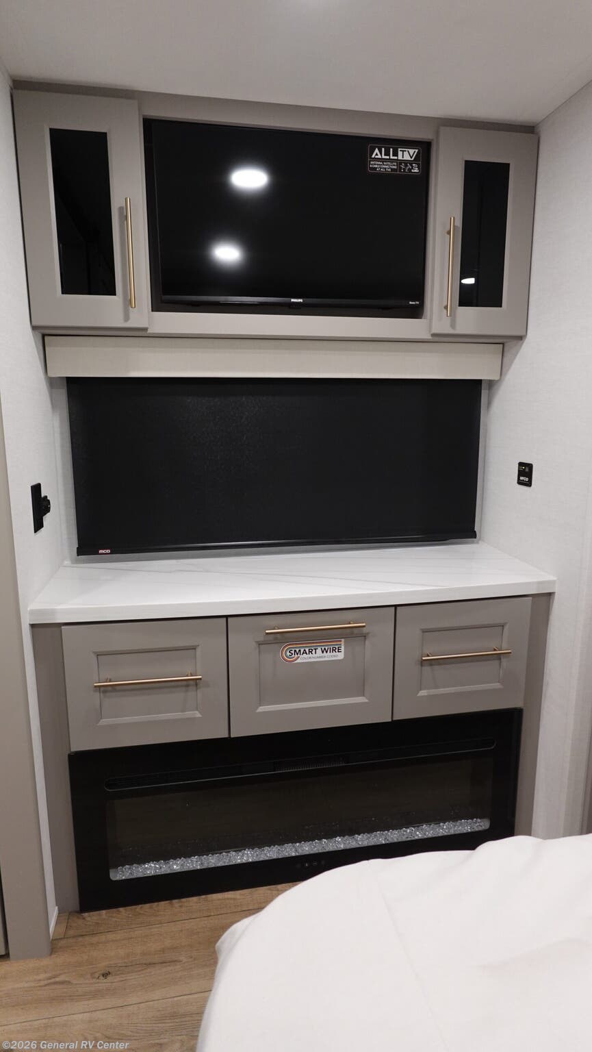 Alliance RV Benchmark 44LFT destination trailer highlights Two Full Bathrooms Two Lofts Washer/Dryer Dual Fireplaces L-Shaped Sofa This destination trailer is perfect for a big crowd since it has one Power Tilting king bed, three mattress and an L- shape sofa. Experience the in-home feeling with the amazing kitchen and living room, furnished with a Kitchen island, L- shape sofa and a residential 110 V fridge. Also, you can sense the extreme coziness thanks to the dual fire places and get 24/7 entertainment due to the four TVs along the trailer. Plenty of place can be found in the front and rear loft bedrooms with three wardrobes in total. Lastly the two full bathrooms will allow you to comfortably take a shower after a long day. With any Benchmark destination trailer by Alliance RV, you will enjoy luxury features at every turn! The high gloss fiberglass exterior is ultra sleek, and the Azdel composite fiberglass sidewalls add durability so you can camp for years to come. You'll also find a residential exterior garden hose connection outside, along with a powder coated aluminum rear ladder, and an auxiliary LP tank hook up if you want to bring your grill along. Head inside to find hardwood cabinetry, solid surface countertops throughout, oversized windows in all rooms, and MCD roller shades throughout. The 45,000 BTU A/C and 60,000 BTU furnace will keep you comfortable year around, and there is a stackable washer and dryer to make full-time RV living easier than ever!