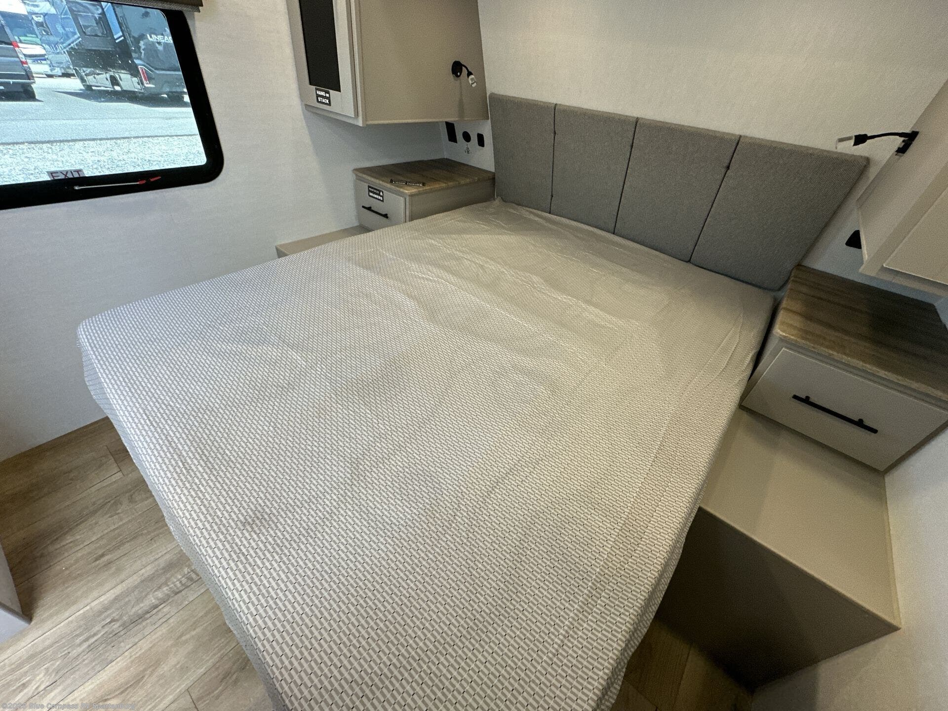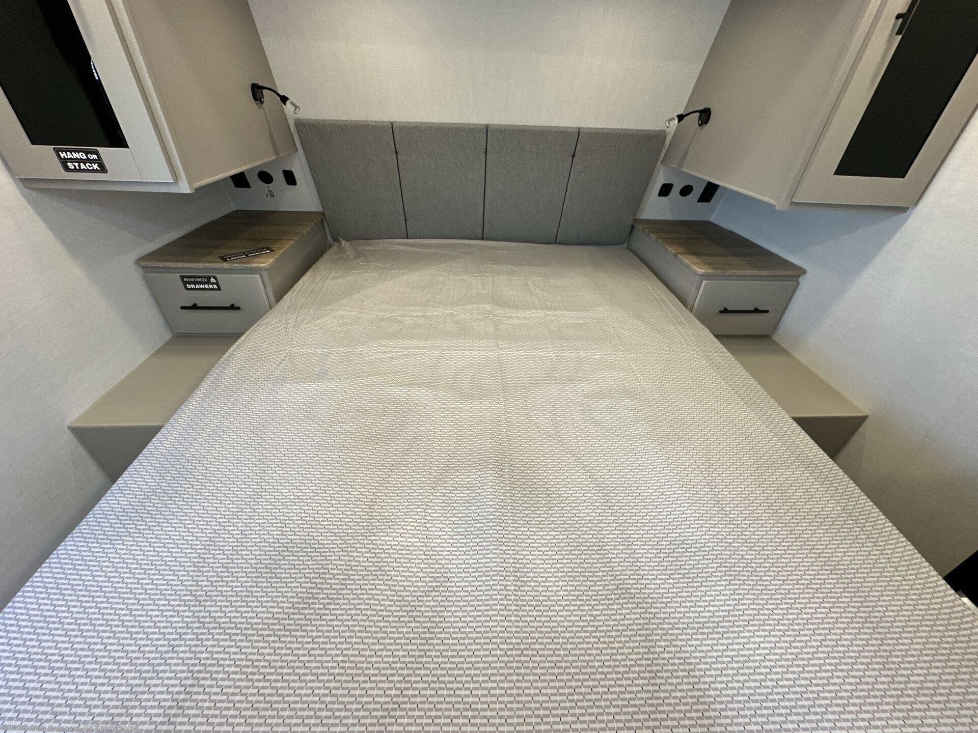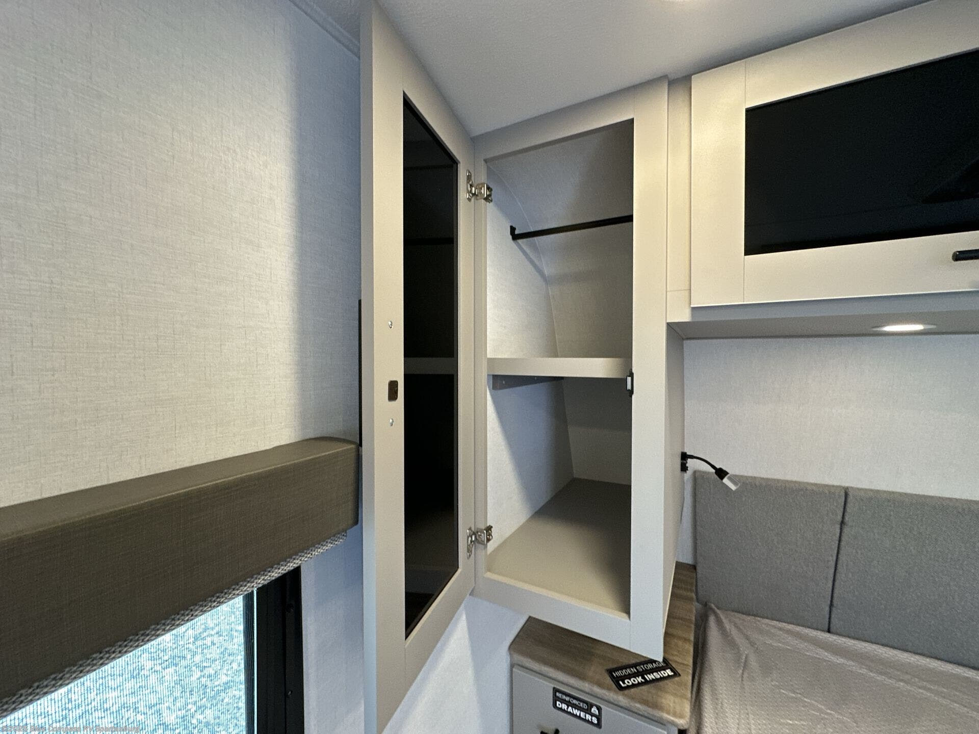 Grab your hiking boots and your sense of adventure for fun camping trips in this single slide out travel trailer. The rear booth dinette includes overhead storage for your things and the sofa slide out is in great view of the 40" HDTV. There is also a fireplace here that will make your space feel more like home plus more storage space, including an entryway pantry and storage above the 10 cu. ft. 12V refrigerator. A walk-through bath will take you to the front master bedroom with a queen bed, wardrobe nightstands, plus its own exterior entry door!