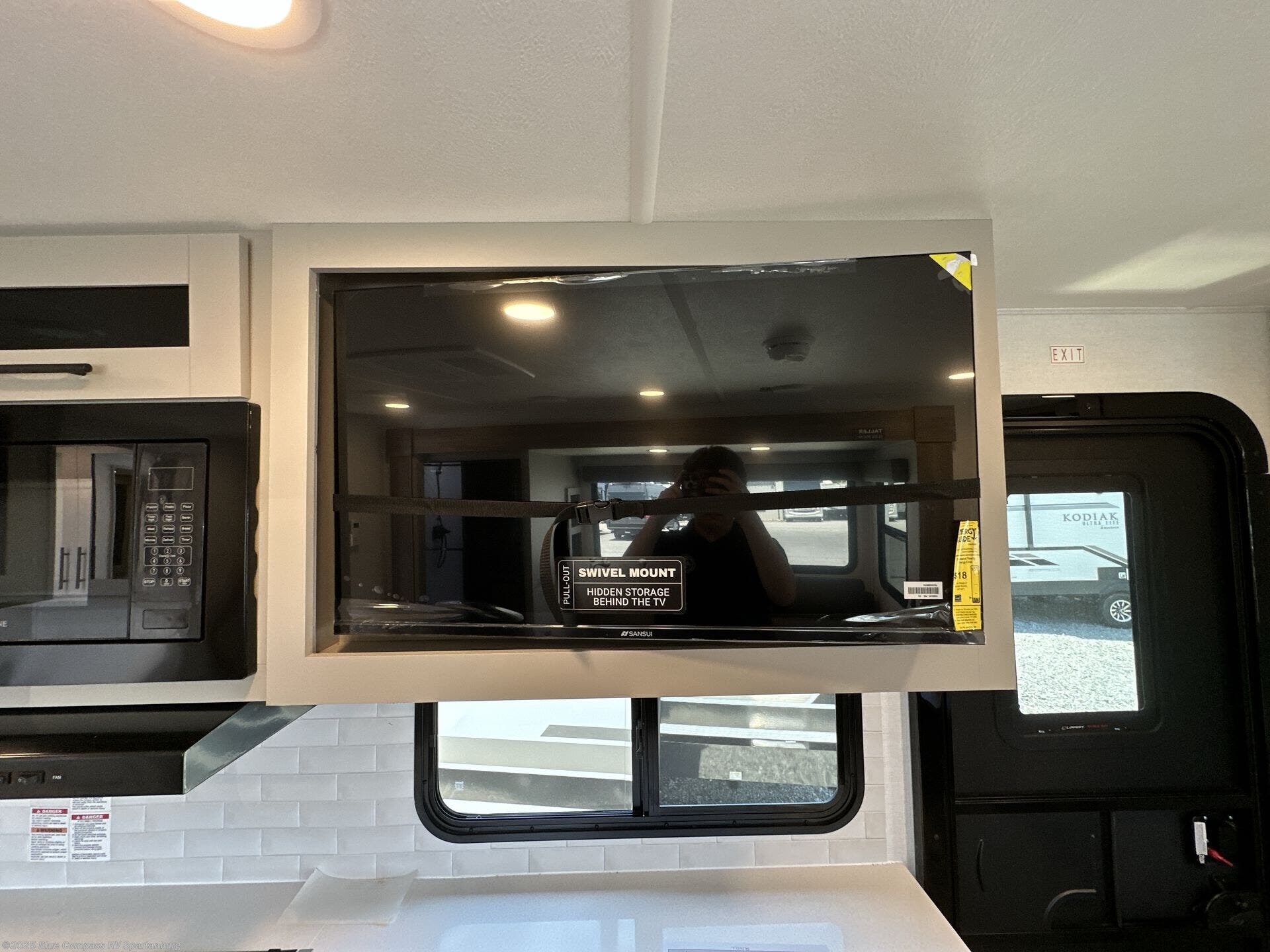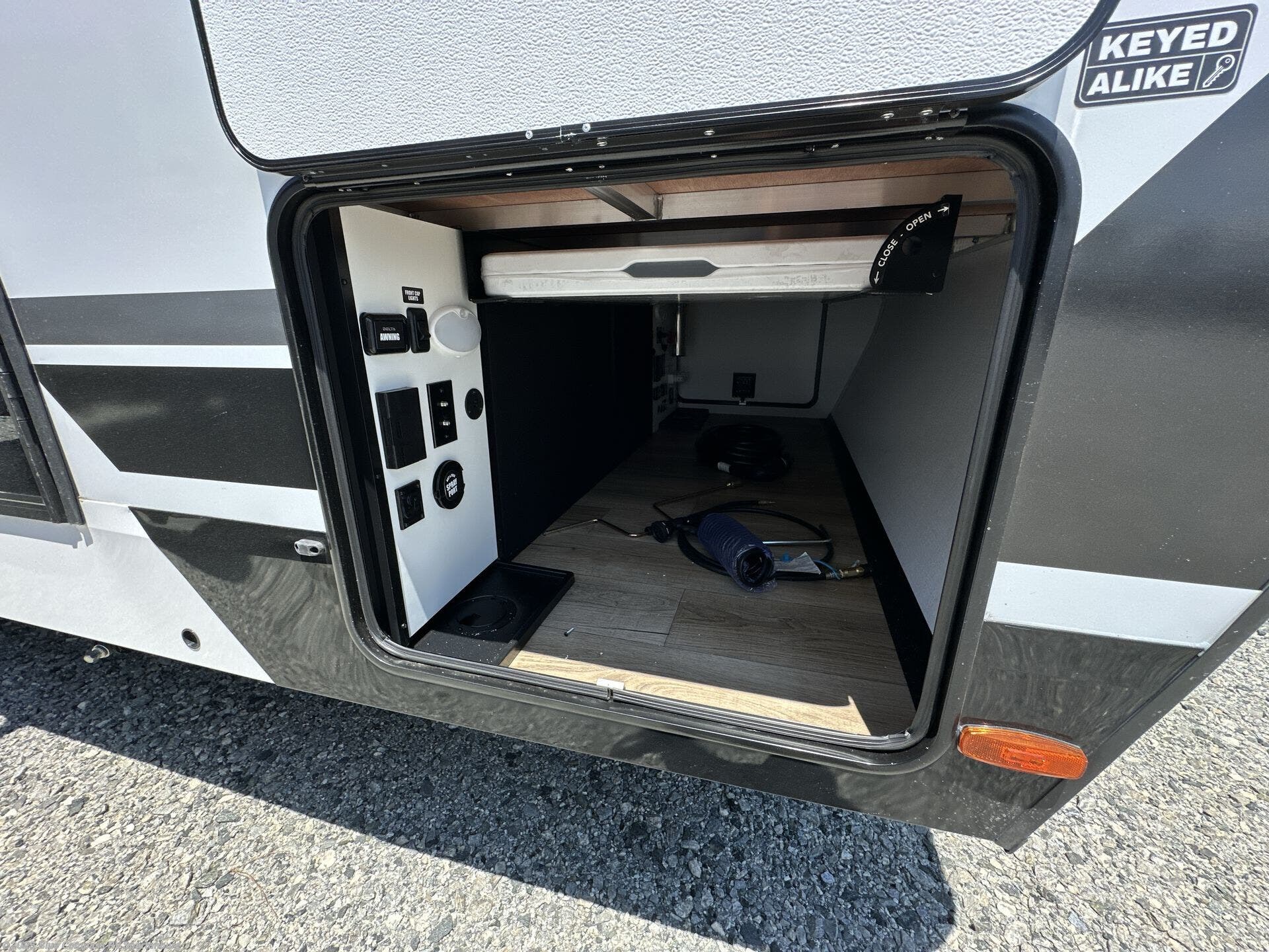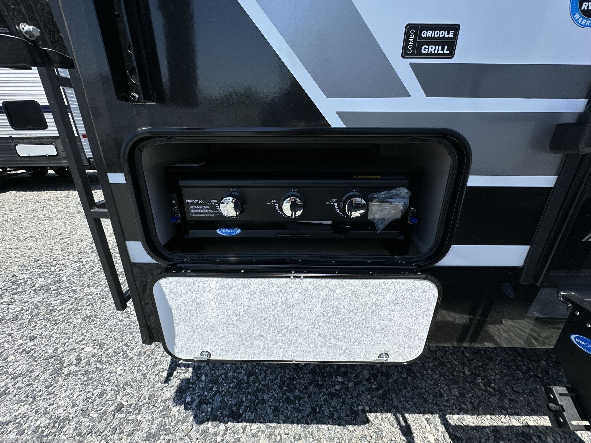 Grab your hiking boots and your sense of adventure for fun camping trips in this single slide out travel trailer. The rear booth dinette includes overhead storage for your things and the sofa slide out is in great view of the 40" HDTV. There is also a fireplace here that will make your space feel more like home plus more storage space, including an entryway pantry and storage above the 10 cu. ft. 12V refrigerator. A walk-through bath will take you to the front master bedroom with a queen bed, wardrobe nightstands, plus its own exterior entry door!