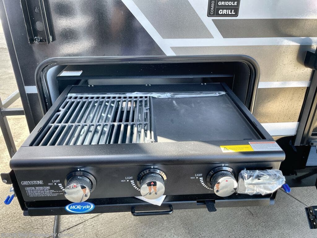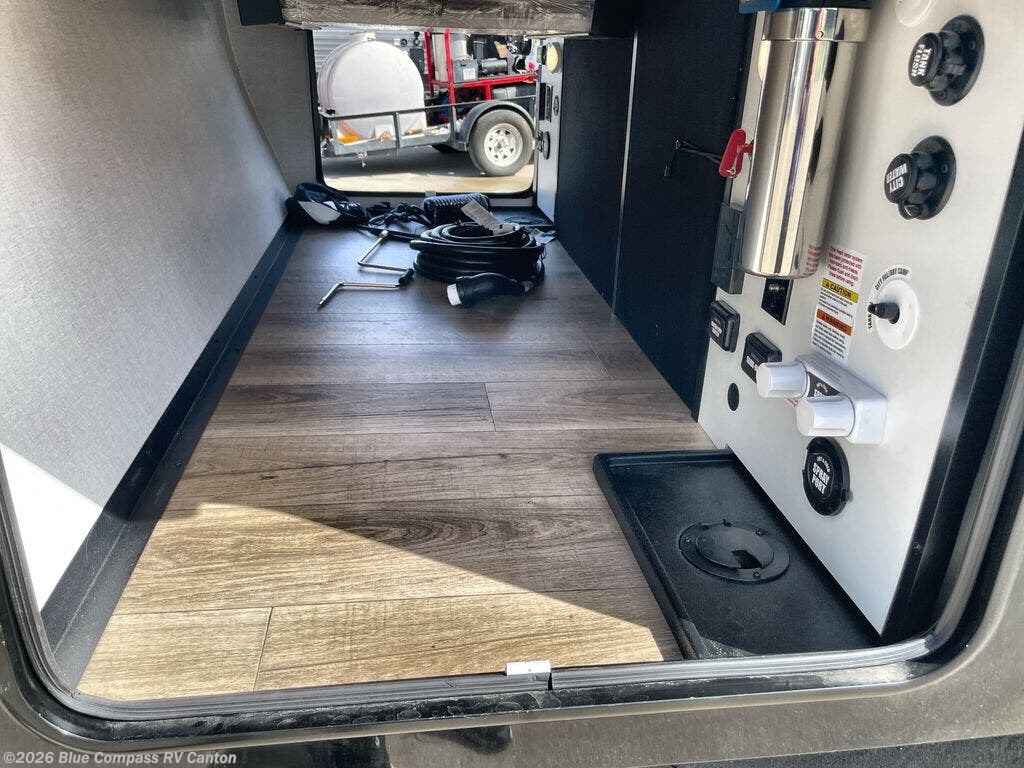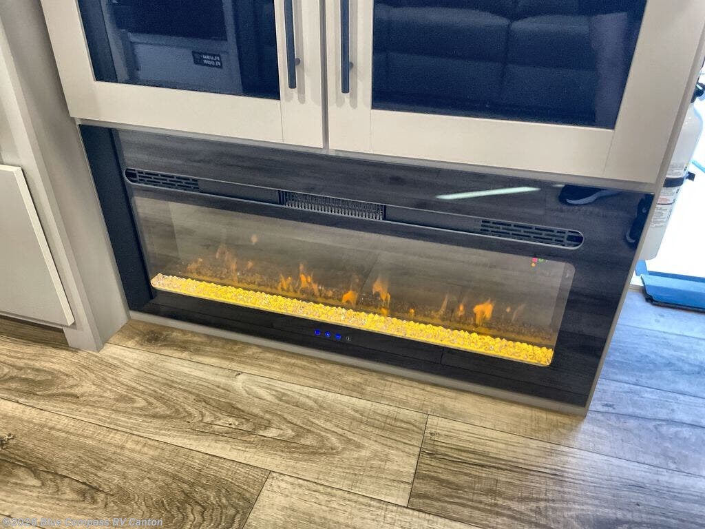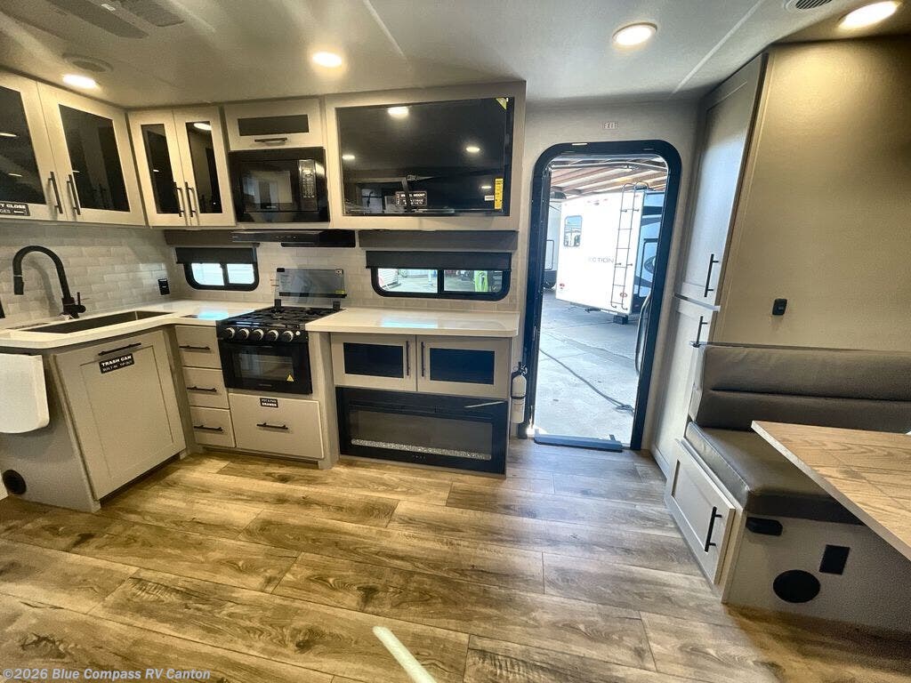 Grab your hiking boots and your sense of adventure for fun camping trips in this single slide out travel trailer. The rear booth dinette includes overhead storage for your things and the sofa slide out is in great view of the 40" HDTV. There is also a fireplace here that will make your space feel more like home plus more storage space, including an entryway pantry and storage above the 10 cu. ft. 12V refrigerator. A walk-through bath will take you to the front master bedroom with a queen bed, wardrobe nightstands, plus its own exterior entry door!
