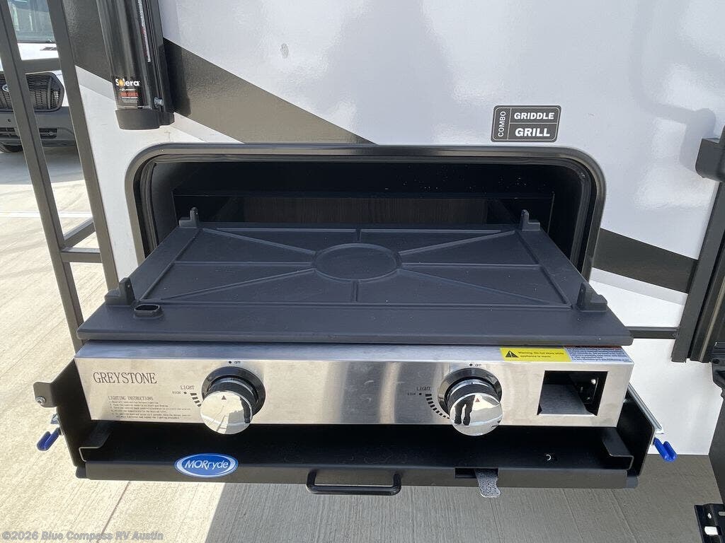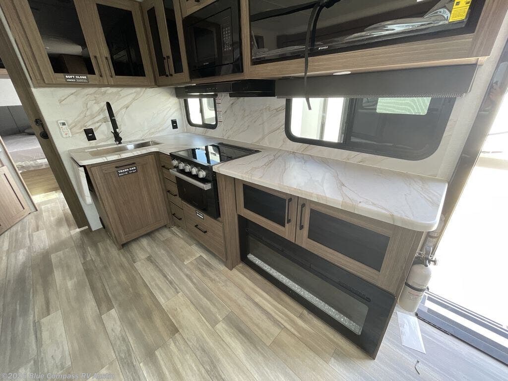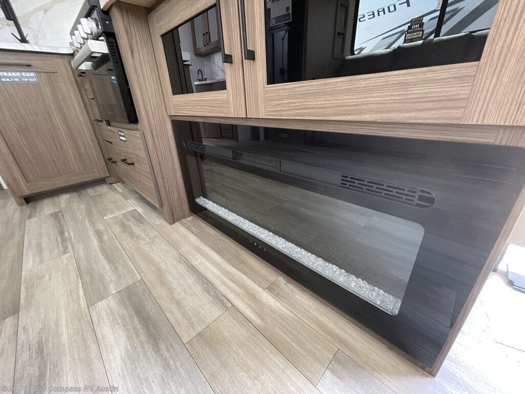 Grab your hiking boots and your sense of adventure for fun camping trips in this single slide out travel trailer. The rear booth dinette includes overhead storage for your things and the sofa slide out is in great view of the 40" HDTV. There is also a fireplace here that will make your space feel more like home plus more storage space, including an entryway pantry and storage above the 10 cu. ft. 12V refrigerator. A walk-through bath will take you to the front master bedroom with a queen bed, wardrobe nightstands, plus its own exterior entry door!