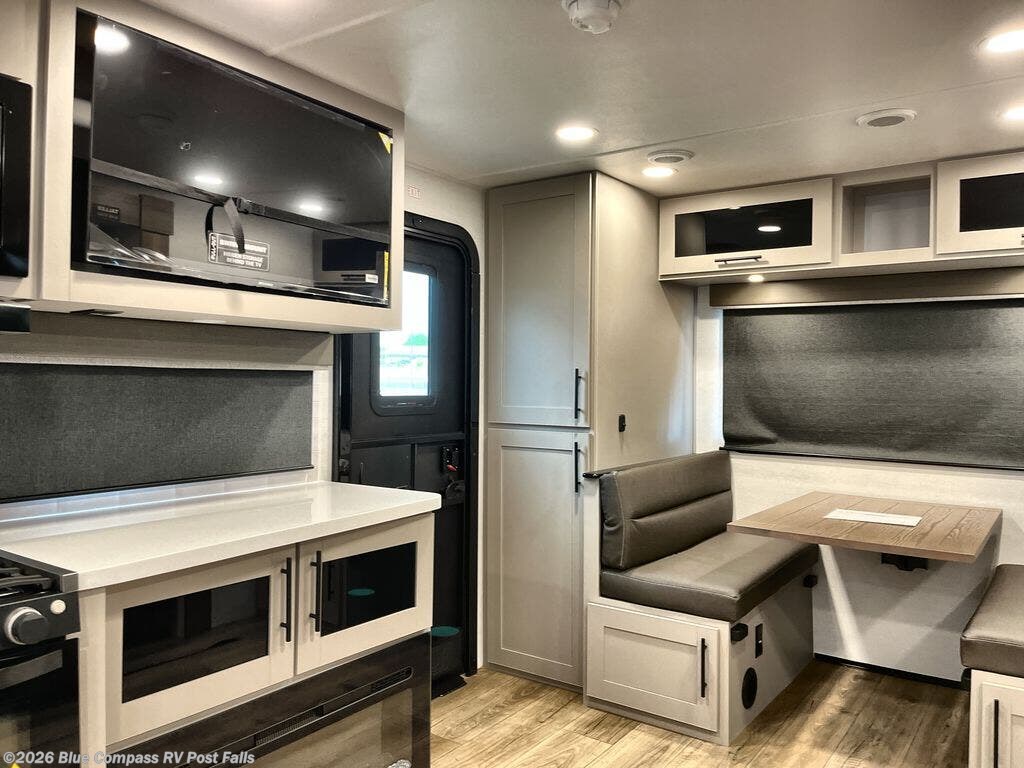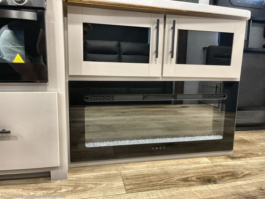 Grab your hiking boots and your sense of adventure for fun camping trips in this single slide out travel trailer. The rear booth dinette includes overhead storage for your things and the sofa slide out is in great view of the 40" HDTV. There is also a fireplace here that will make your space feel more like home plus more storage space, including an entryway pantry and storage above the 10 cu. ft. 12V refrigerator. A walk-through bath will take you to the front master bedroom with a queen bed, wardrobe nightstands, plus its own exterior entry door!