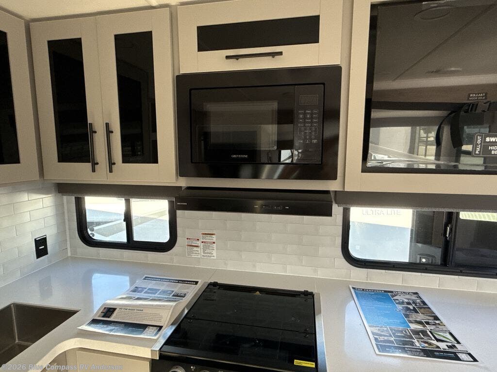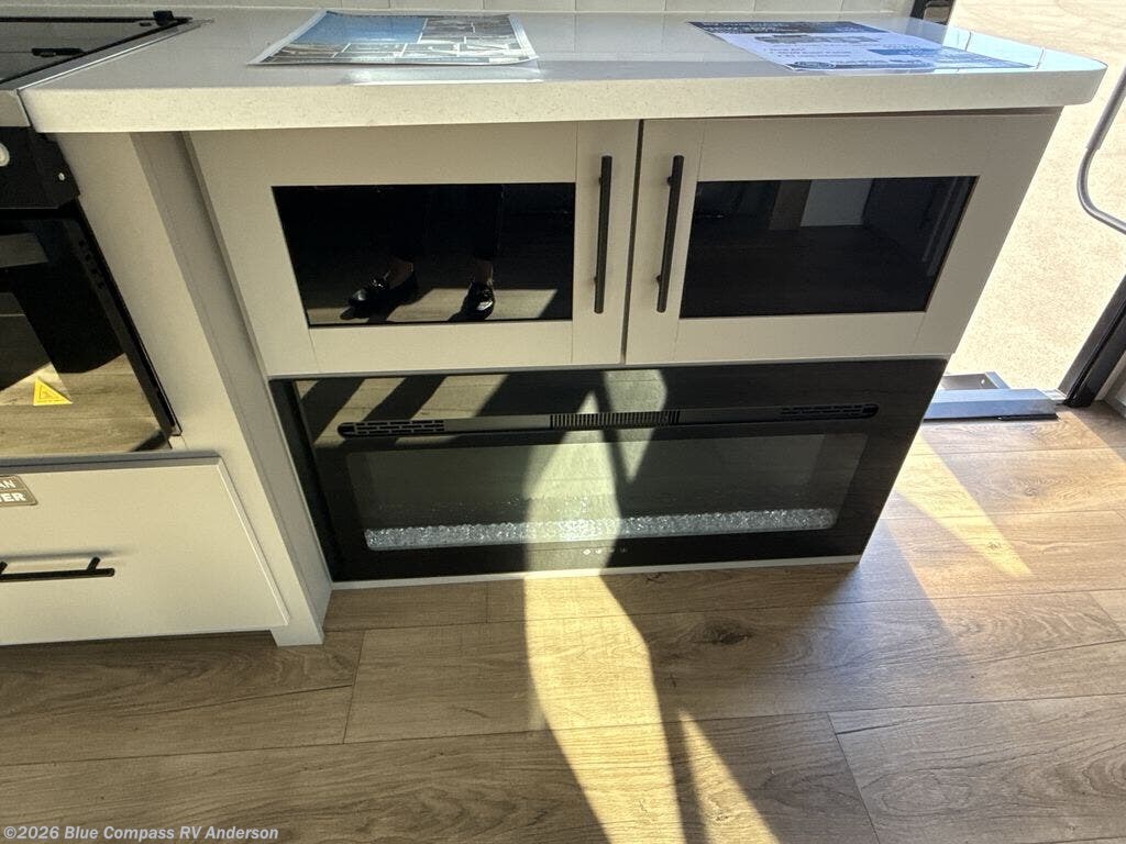 Grab your hiking boots and your sense of adventure for fun camping trips in this single slide out travel trailer. The rear booth dinette includes overhead storage for your things and the sofa slide out is in great view of the 40" HDTV. There is also a fireplace here that will make your space feel more like home plus more storage space, including an entryway pantry and storage above the 10 cu. ft. 12V refrigerator. A walk-through bath will take you to the front master bedroom with a queen bed, wardrobe nightstands, plus its own exterior entry door!