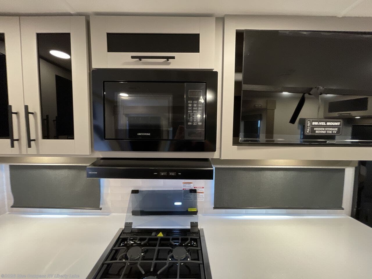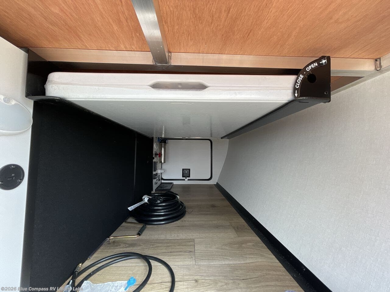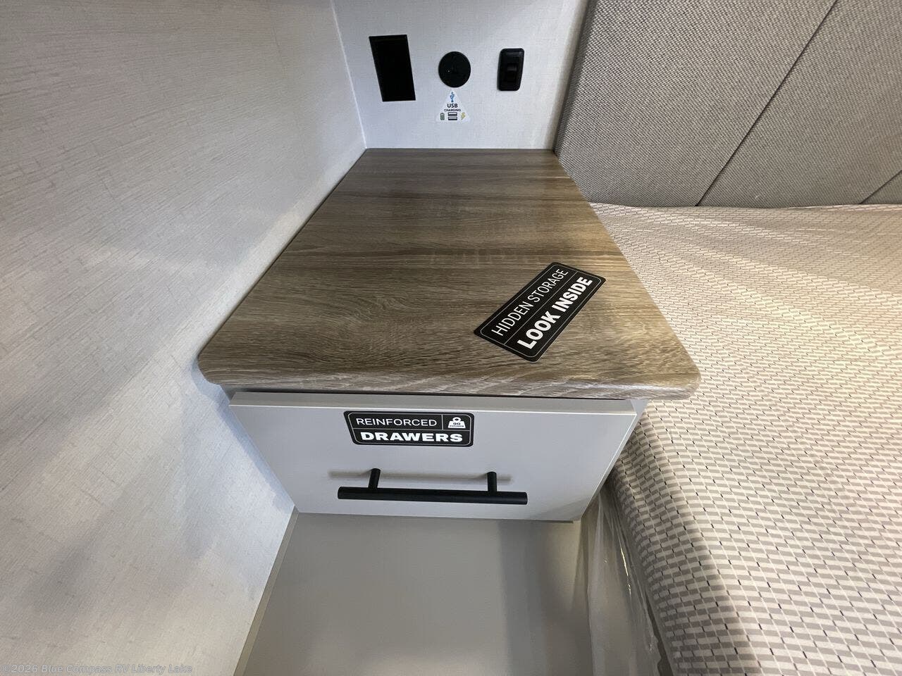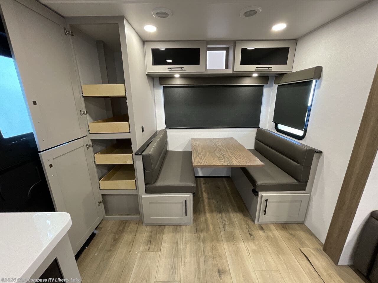 Grab your hiking boots and your sense of adventure for fun camping trips in this single slide out travel trailer. The rear booth dinette includes overhead storage for your things and the sofa slide out is in great view of the 40" HDTV. There is also a fireplace here that will make your space feel more like home plus more storage space, including an entryway pantry and storage above the 10 cu. ft. 12V refrigerator. A walk-through bath will take you to the front master bedroom with a queen bed, wardrobe nightstands, plus its own exterior entry door!