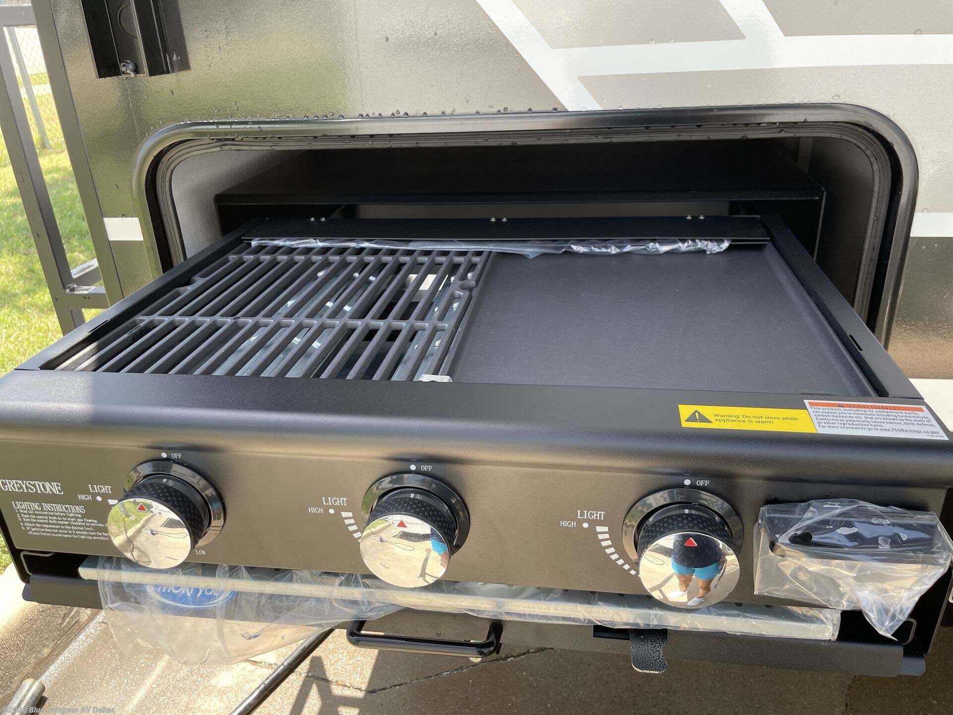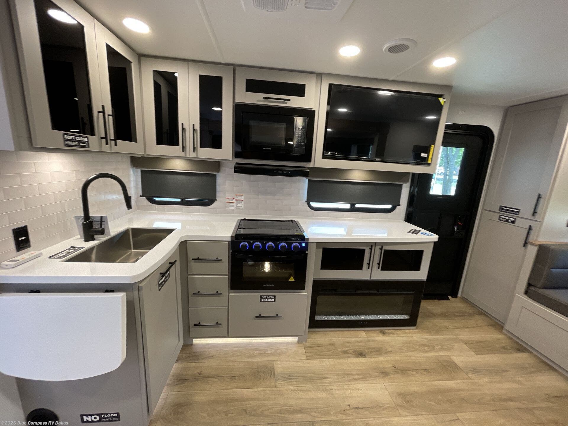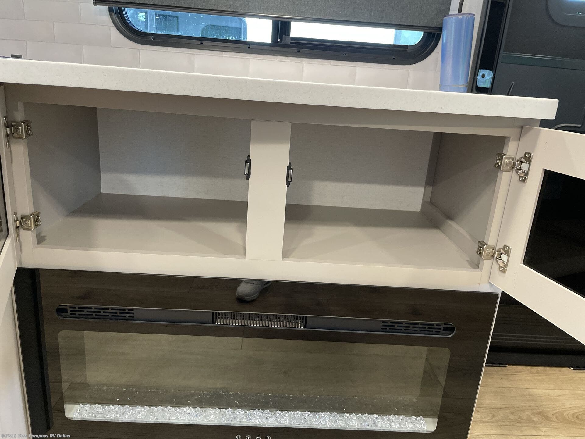 Grab your hiking boots and your sense of adventure for fun camping trips in this single slide out travel trailer. The rear booth dinette includes overhead storage for your things and the sofa slide out is in great view of the 40" HDTV. There is also a fireplace here that will make your space feel more like home plus more storage space, including an entryway pantry and storage above the 10 cu. ft. 12V refrigerator. A walk-through bath will take you to the front master bedroom with a queen bed, wardrobe nightstands, plus its own exterior entry door!