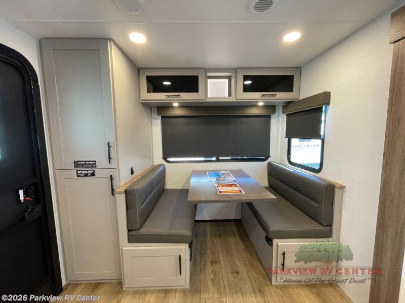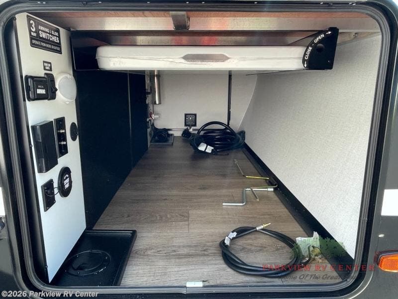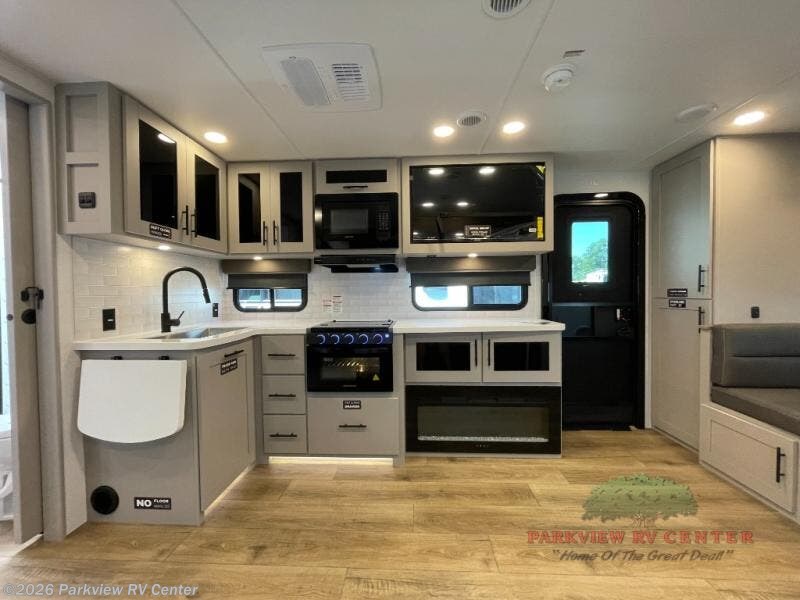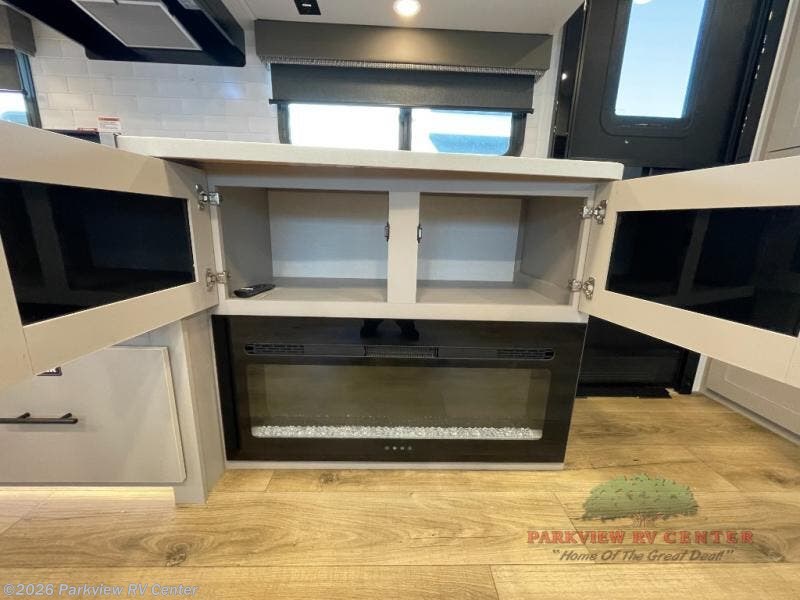 Grab your hiking boots and your sense of adventure for fun camping trips in this single slide out travel trailer. The rear booth dinette includes overhead storage for your things and the sofa slide out is in great view of the 40" HDTV. There is also a fireplace here that will make your space feel more like home plus more storage space, including an entryway pantry and storage above the 10 cu. ft. 12V refrigerator. A walk-through bath will take you to the front master bedroom with a queen bed, wardrobe nightstands, plus its own exterior entry door!