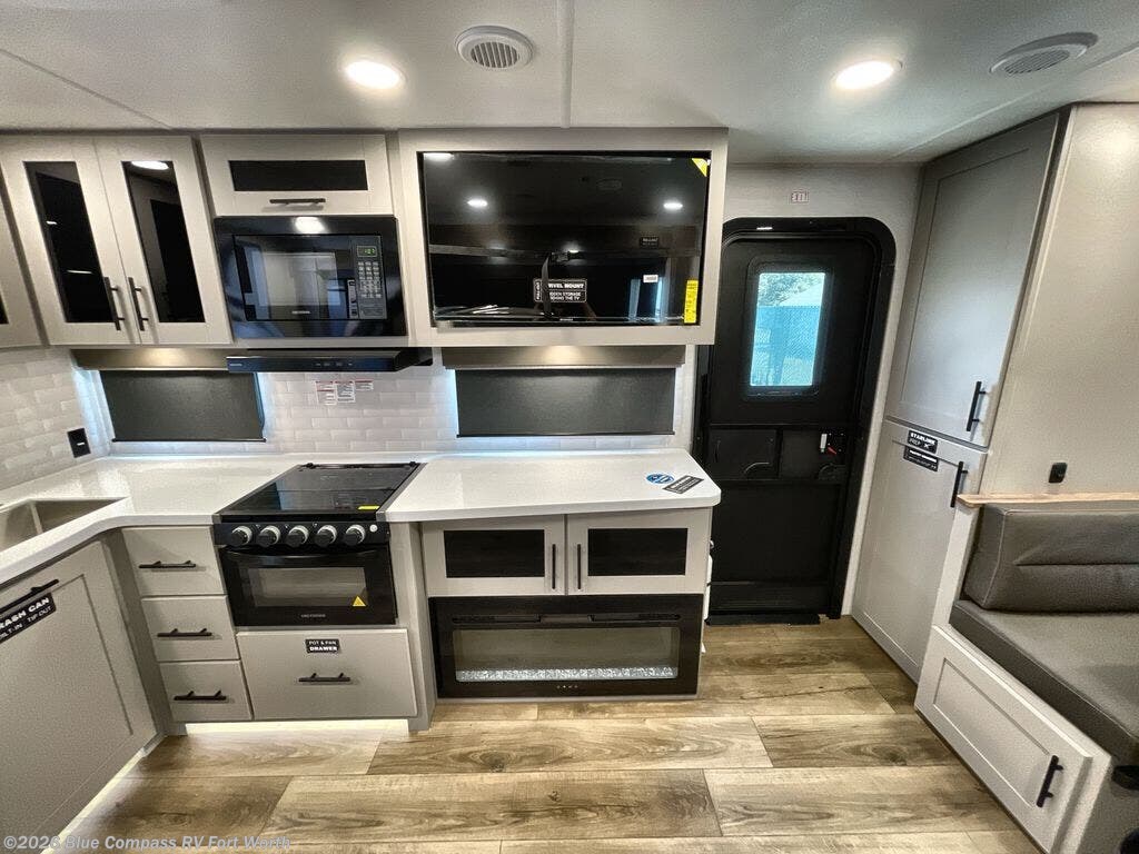 Grab your hiking boots and your sense of adventure for fun camping trips in this single slide out travel trailer. The rear booth dinette includes overhead storage for your things and the sofa slide out is in great view of the 40" HDTV. There is also a fireplace here that will make your space feel more like home plus more storage space, including a pantry with pull out trays and storage above the 10 cu. ft. 12V refrigerator. A walk-through bath will take you to the front master bedroom with a queen bed, wardrobe nightstands, plus its own exterior entry door!