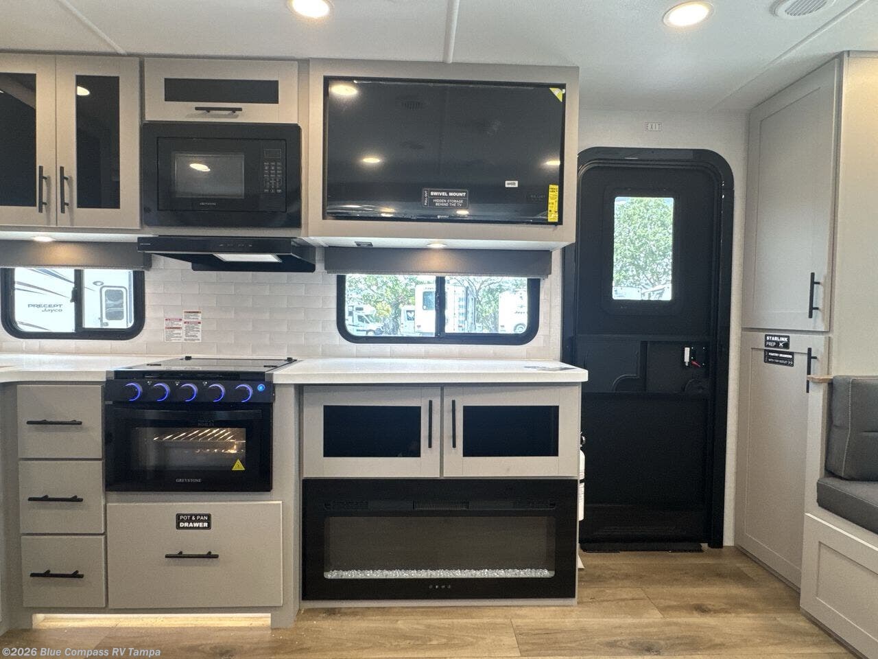 Grab your hiking boots and your sense of adventure for fun camping trips in this single slide out travel trailer. The rear booth dinette includes overhead storage for your things and the sofa slide out is in great view of the 40" HDTV. There is also a fireplace here that will make your space feel more like home plus more storage space, including a pantry with pull out trays and storage above the 10 cu. ft. 12V refrigerator. A walk-through bath will take you to the front master bedroom with a queen bed, wardrobe nightstands, plus its own exterior entry door!