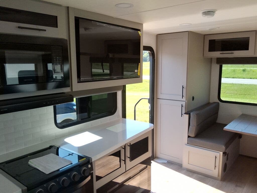 Grab your hiking boots and your sense of adventure for fun camping trips in this single slide out travel trailer. The rear booth dinette includes overhead storage for your things and the sofa slide out is in great view of the 40" HDTV. There is also a fireplace here that will make your space feel more like home plus more storage space, including a pantry with pull out trays and storage above the 10 cu. ft. 12V refrigerator. A walk-through bath will take you to the front master bedroom with a queen bed, wardrobe nightstands, plus its own exterior entry door!