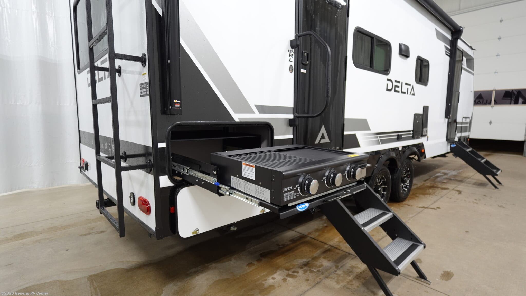 Discover the 2026 Alliance RV Delta 252RL, a perfect blend of comfort and functionality designed for those who crave adventure without sacrificing the comforts of home. This RV offers a spacious layout with a center kitchen and rear living area, making it ideal for entertaining or relaxing after a day of exploration. The 18-foot powered retractable awning extends your living space outdoors, providing a perfect spot for enjoying nature or dining al fresco with the included 6-foot folding camp table. Inside, you'll find a cozy queen bed in the front bedroom, offering a peaceful retreat. The living area boasts a convertible sofa and dinette, accommodating up to six sleepers comfortably. The well-appointed kitchen features a three-burner cooktop and a full-size electric refrigerator, ensuring you have all the essentials for gourmet meals on the road. With ample storage, including overhead compartments and a pantry, you'll have plenty of room for all your travel necessities. The Delta 252RL is equipped with a 30” x 36” shower and a fireplace for added comfort. The dual axles and Goodyear Endurance tires ensure a smooth ride, while the 45-gallon fresh water tank and 90-gallon gray water capacity mean extended stays are a breeze. Whether you're a weekend warrior or a full-time traveler, this RV is ready to accompany you on your next journey. For more details, visit your nearest General RV Dealership.