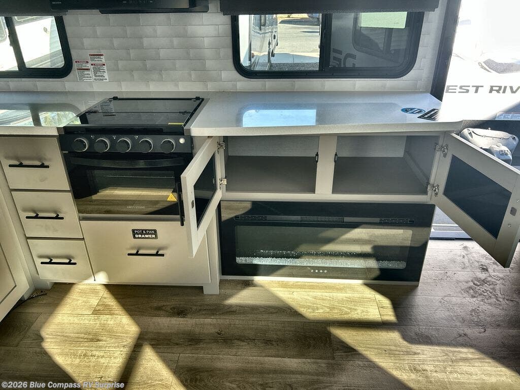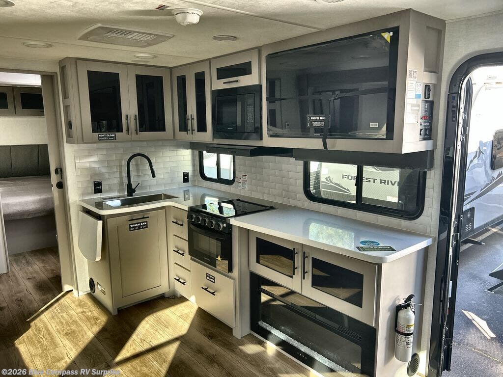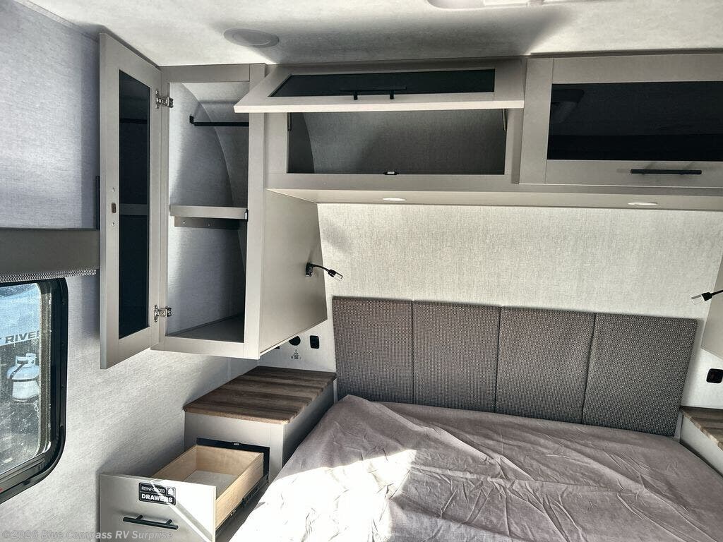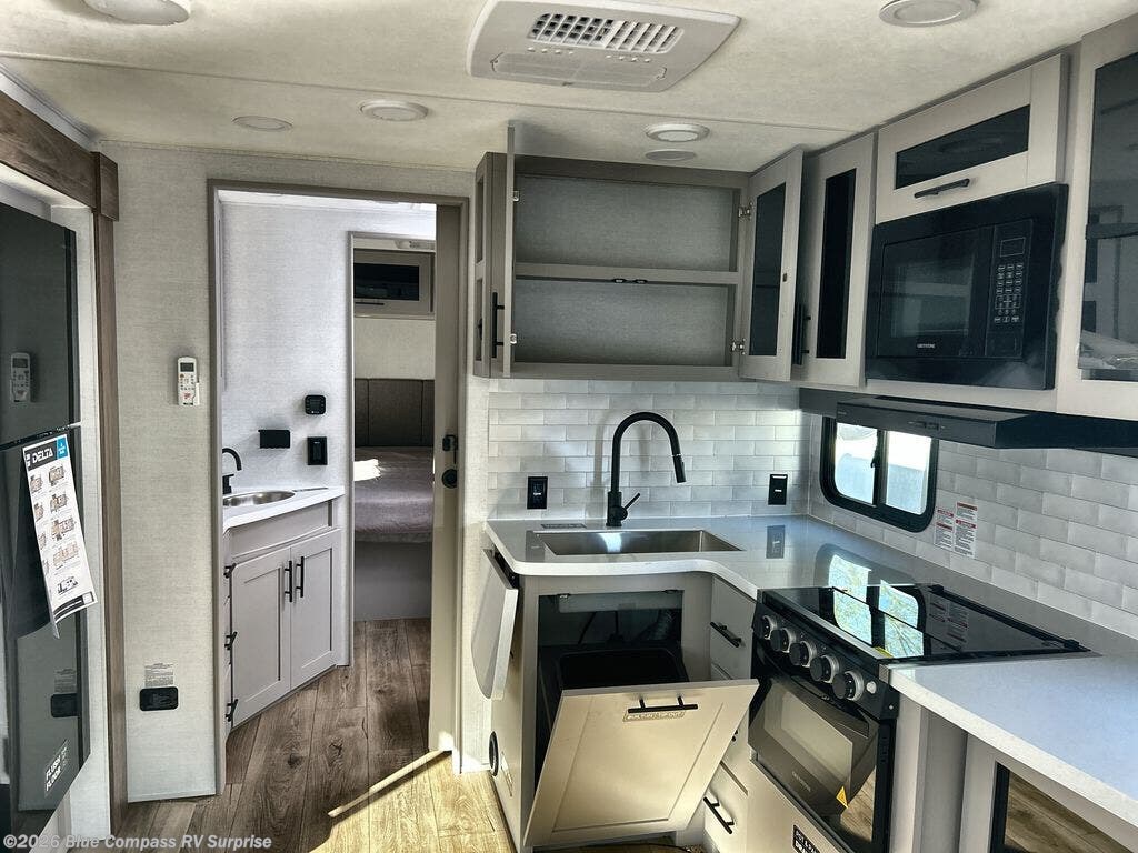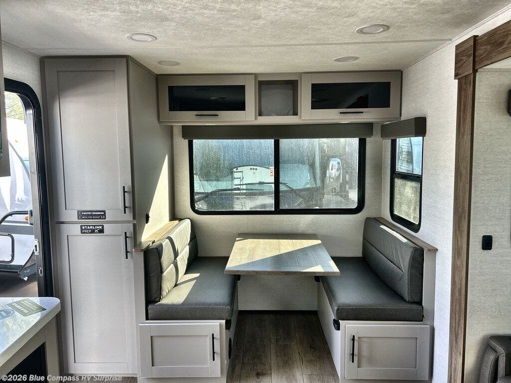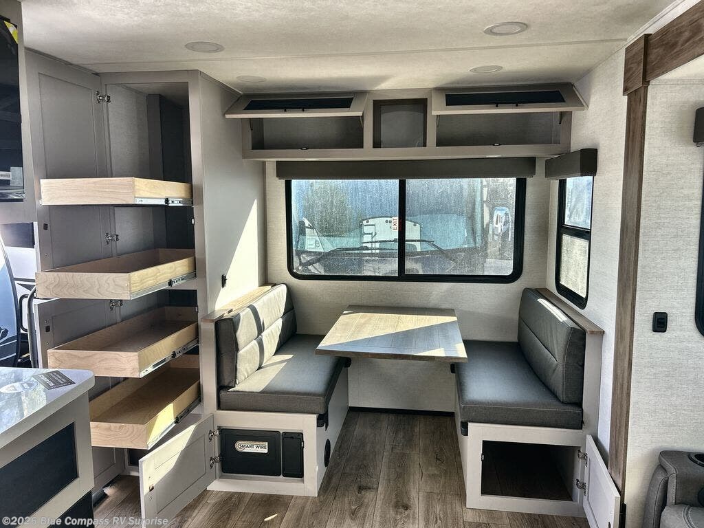 Grab your hiking boots and your sense of adventure for fun camping trips in this single slide out travel trailer. The rear booth dinette includes overhead storage for your things and the sofa slide out is in great view of the 40" HDTV. There is also a fireplace here that will make your space feel more like home plus more storage space, including a pantry with pull out trays and storage above the 10 cu. ft. 12V refrigerator. A walk-through bath will take you to the front master bedroom with a queen bed, wardrobe nightstands, plus its own exterior entry door!